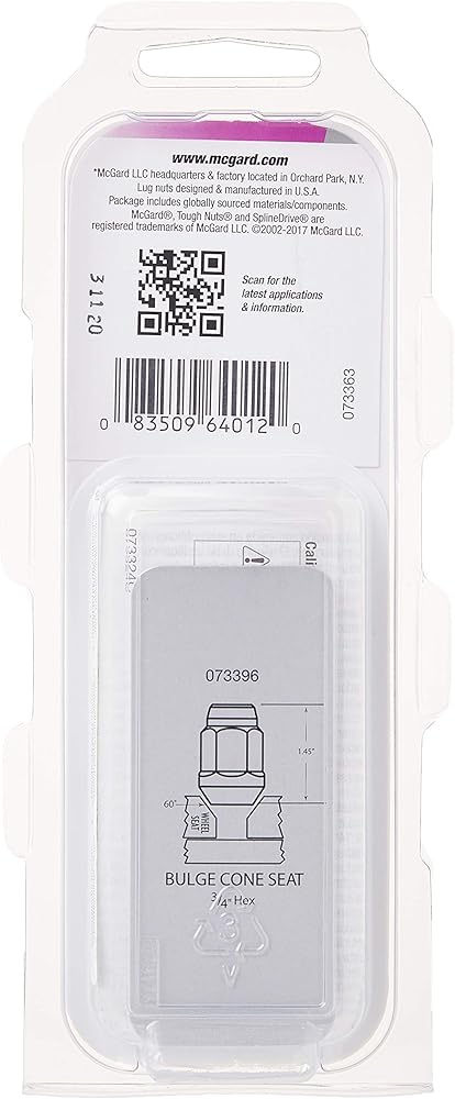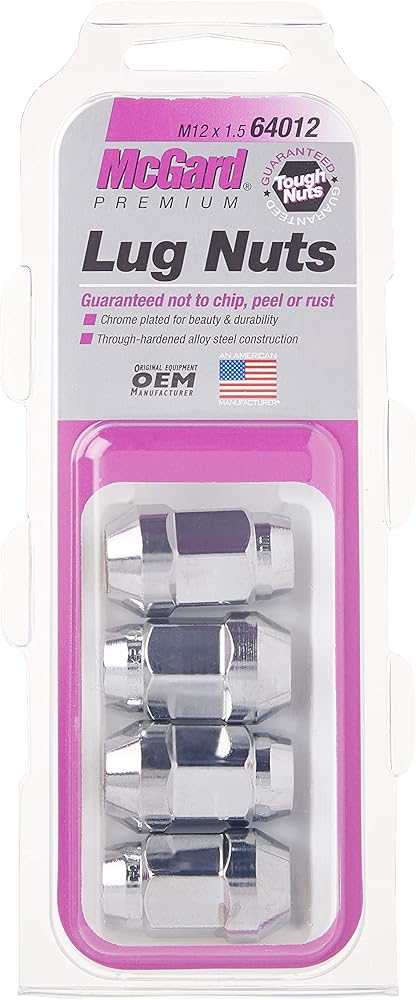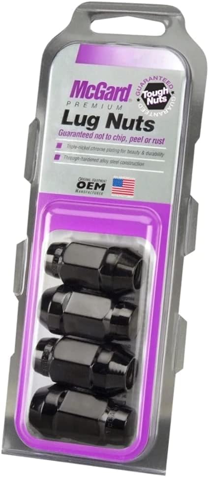 Chrome plated lug nuts lead a tough life. Think about it, harsh elements, nasty corrosive wheel cleaners and lead-foot drivers. Not to mention overzealous impact guns and loose fitting lug wrenches. This kind of treatment destroys ordinary lug nuts which turns even the best looking wheels ugly. Tough Nuts can take the punishment and keep your wheels looking beautiful. chip or peel. McGard manufactures lug nuts in the USA to meet or exceed OEM standards for safety and durability. Every lug nut is fully machined from restricted chemistry steel made specifically for McGard and through-hardened for its unsurpassed level of safety. McGard's plating process includes three layers of nickel and one layer of microporous chrome/black producing a superior finish while protecting against rust. Tough Nuts are designed and built for the real world, because life is tough. Bulge Style Cone Seat lug nuts have an extended seating surface that is designed to match the wider seating surface used on some aluminum wheels. For use with steel or aluminum wheels with exposed decorative lug nuts that are tapered at the bottom. This product may contain globally sourced materials/components.