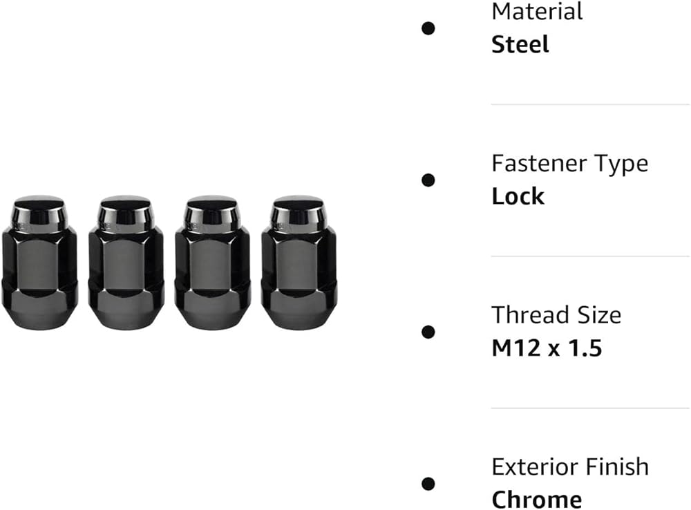 • Seat Style Cone Seat Nut; Thread Size M12 x 1.5; Overall Length 1.45; Hex Size 3/4; Includes 4 Lug Nuts