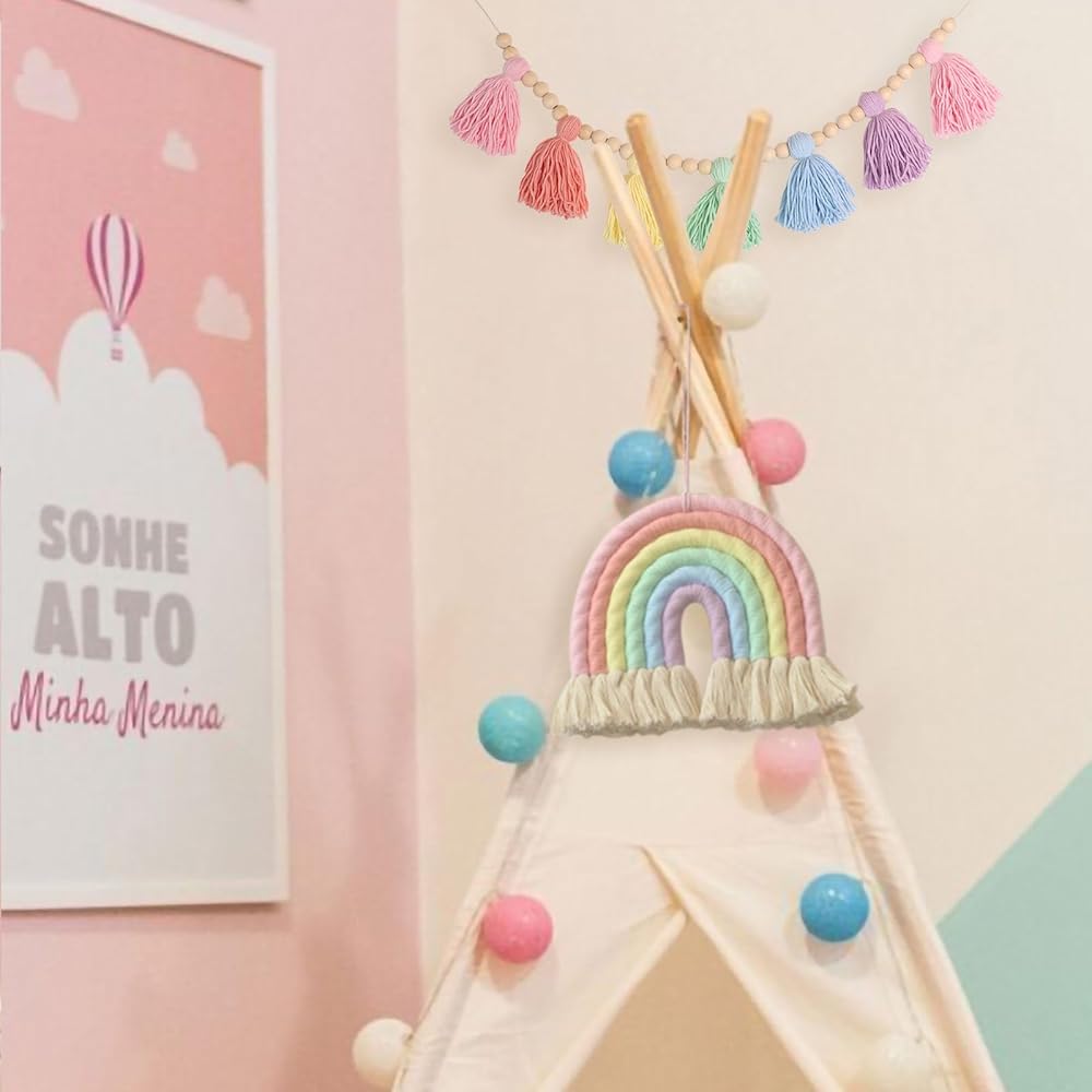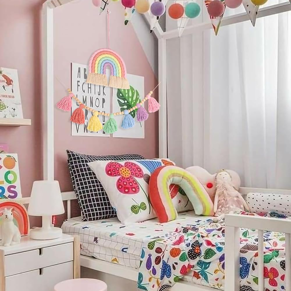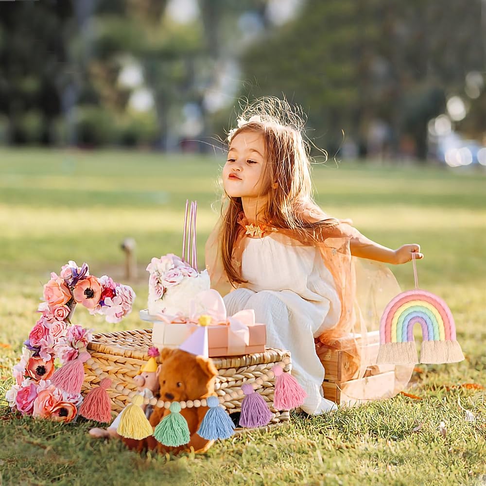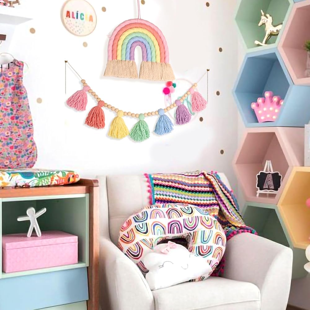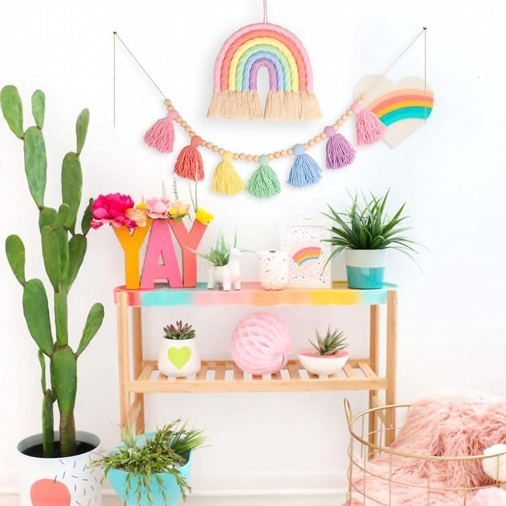 جودة جيدة - تم نسج التعليق على الحائط بألوان قوس قزح وإكليل شرابة قوس قزح يدويًا بخيوط متعددة الألوان، وديكورات رائعة، مصنوعة يدويًا، مريحة الملمس، ليس من السهل أن تتلاشى، ليس من السهل أن تتلف، متينة وآمنة وصحية. يمكن لهذا التعليق المنسوج على الحائط بألوان قوس قزح وإكليل الشرابة بألوان قوس قزح أن يضيف شخصية وسحرًا إلى أي جدار في منزلك.