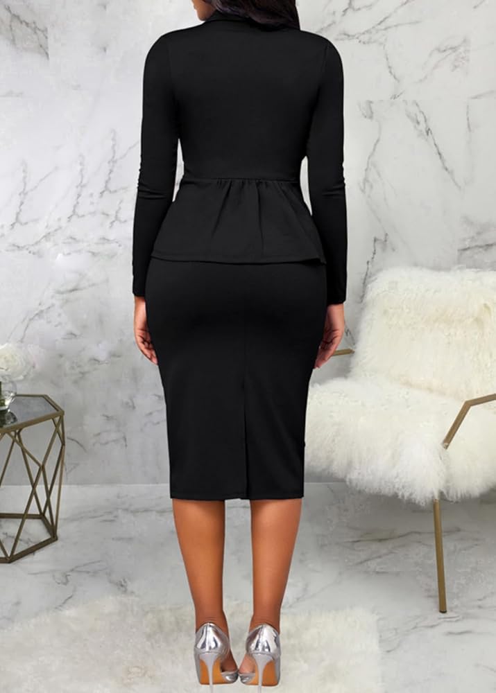 التصميم: أكمام طويلة، سترة بأزرار سفلية، ياقة على شكل حرف V، سحاب غير مرئي، تصميم بفتحة خلفية، خصلة عالية، تنورة متوسطة الطول