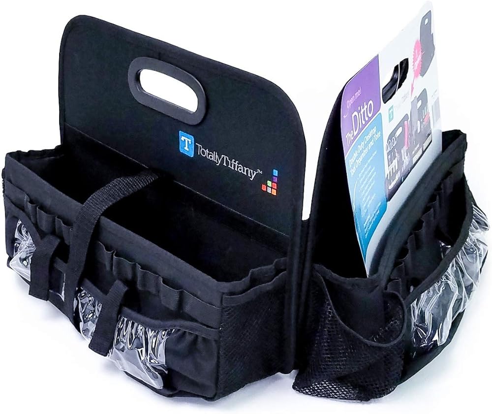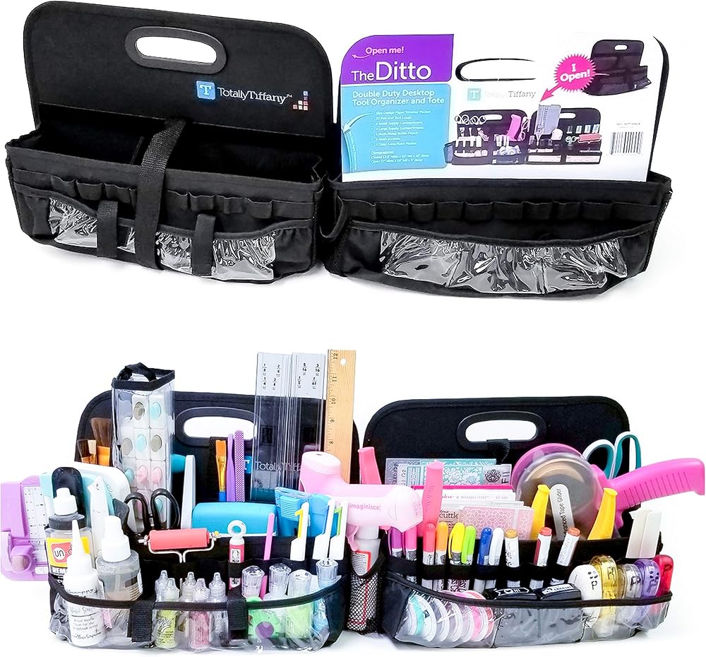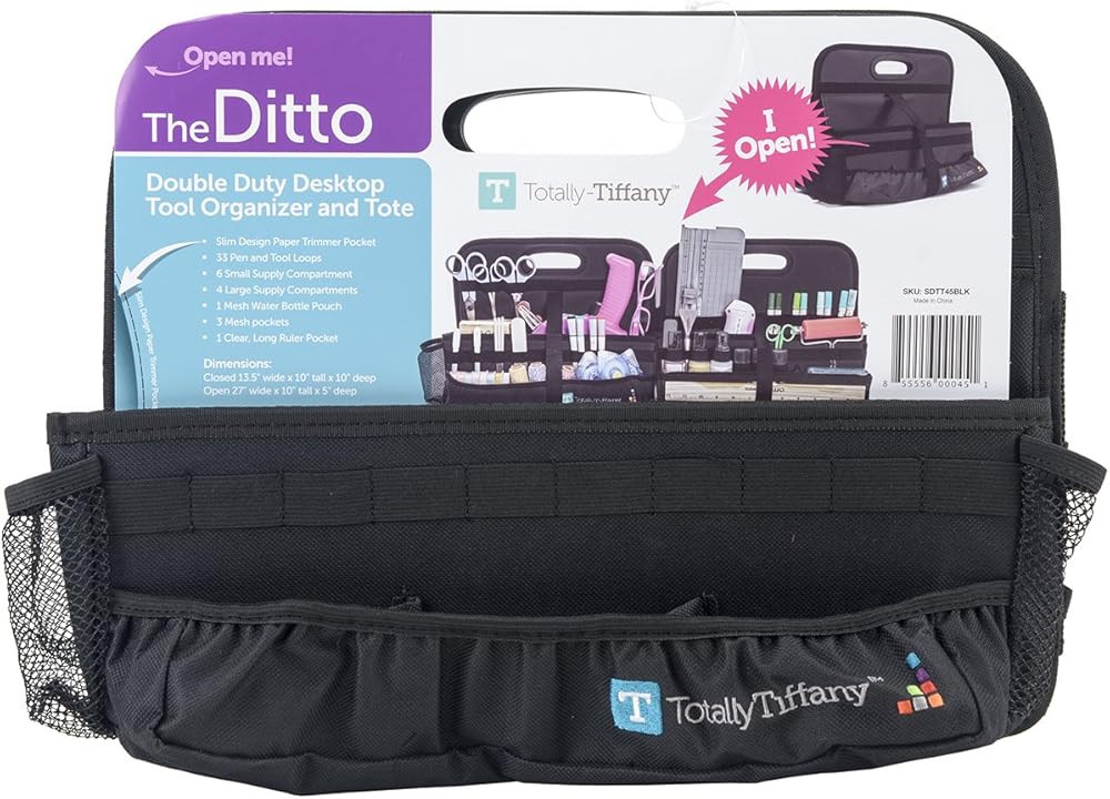 This convenient tote opens up to become a tool organizer. The organizer has many pockets to hold adhesives, punches, scissors, and other tools. There's even room for a trimmer. Elastic bands hold paper piercers, pens, and other tools in place.