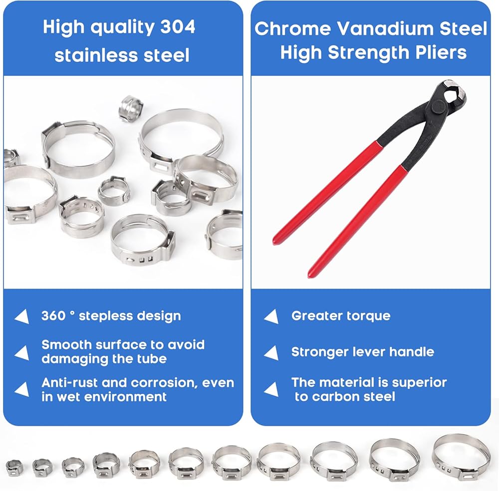 【الحصول على أفضل】مادة المشبك مصنوعة من الفولاذ المقاوم للصدأ 304، وهي أكثر مقاومة للملح، ومضادة للصدأ، ومضادة للتآكل، ومقاومة للماء والزيت. تختلف مادة كماشة رافعة الخرطوم عن الفولاذ الكربوني، فهي مصنوعة من فولاذ الكروم والفانيديوم مع قوة أعلى، وهي أكثر توفيرًا للعمالة ولها عمر أطول.