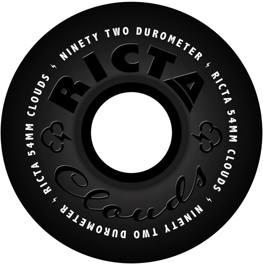 Ricta Wheel Dynamics 56mm Clouds 92a black with black core, debossed and pad printed lettering. Super-soft urethane for cruiser setups and general transportation. Ricta Clouds are the most diverse cruiser wheel family in skateboarding. Ricta makes a soft wheel for any terrain or setup.
