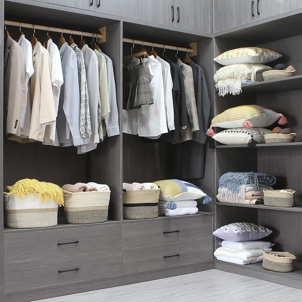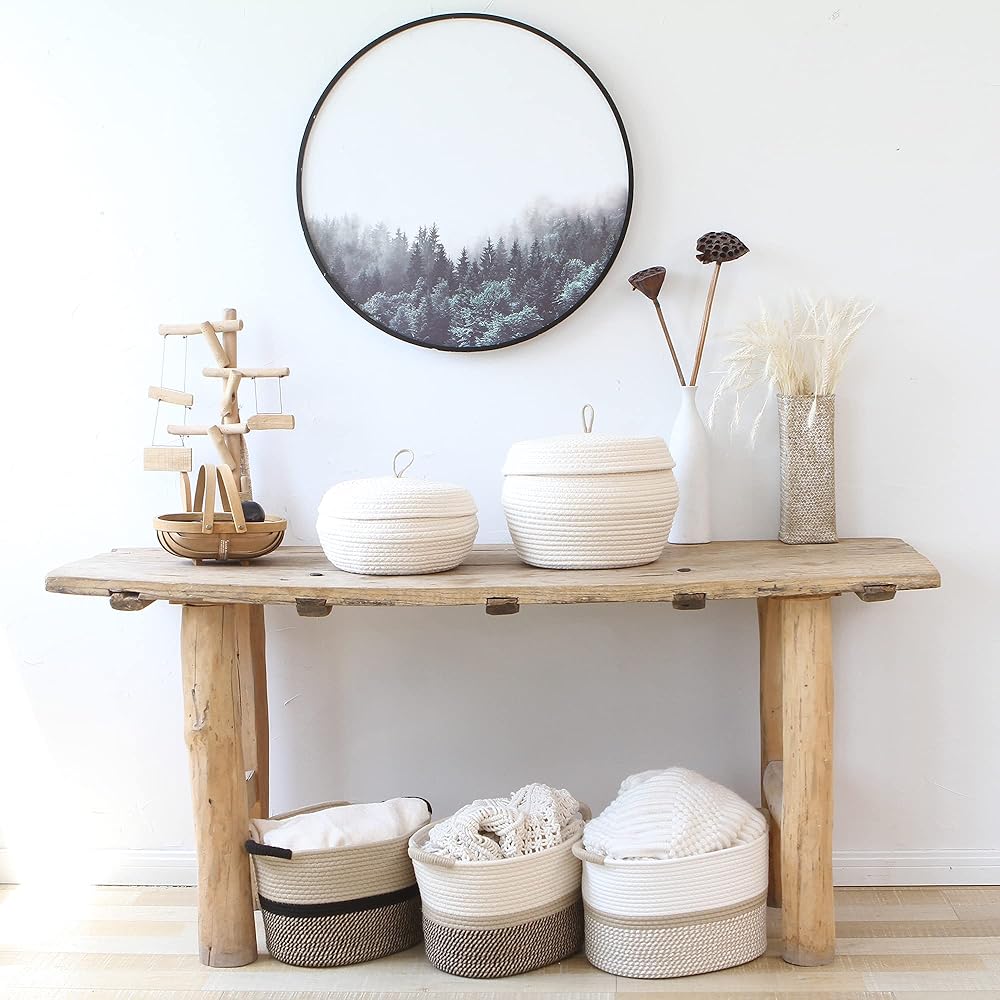 The cotton rope basket features off white and grey to offer natural, clean, stylish aesthetics for seamless coordinating with surrounding décor.