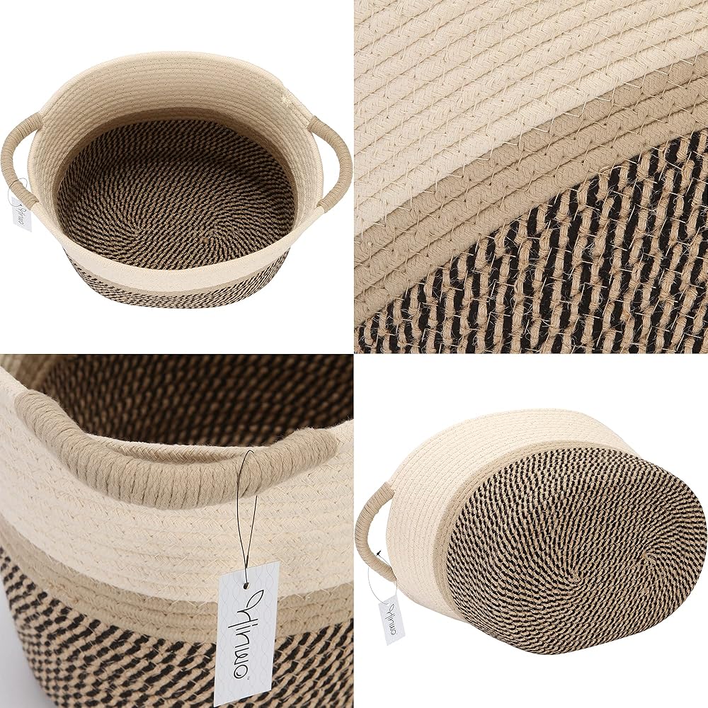 سلة تخزين من الحبال القطنية البيضاوية من Hinwo، منظم حاوية تخزين الحضانة القابلة للطي مع مقابض، 33 × 10 بوصة، كريمي، كاكي وأسود
