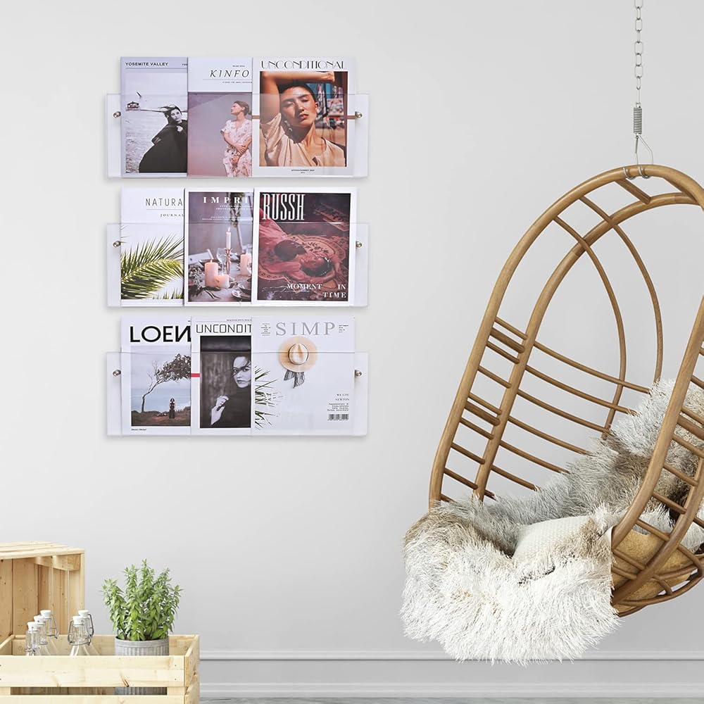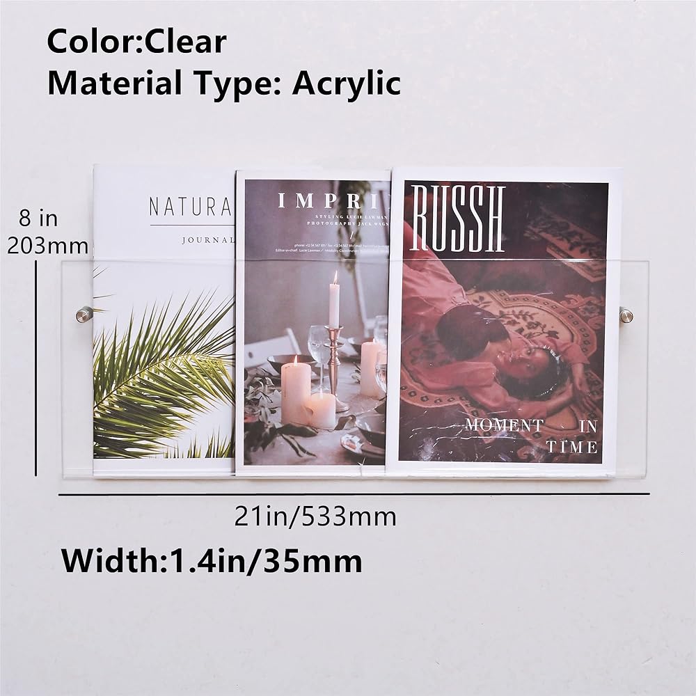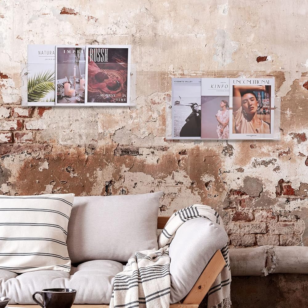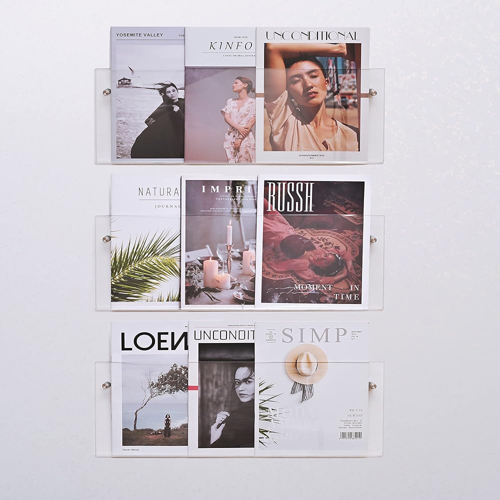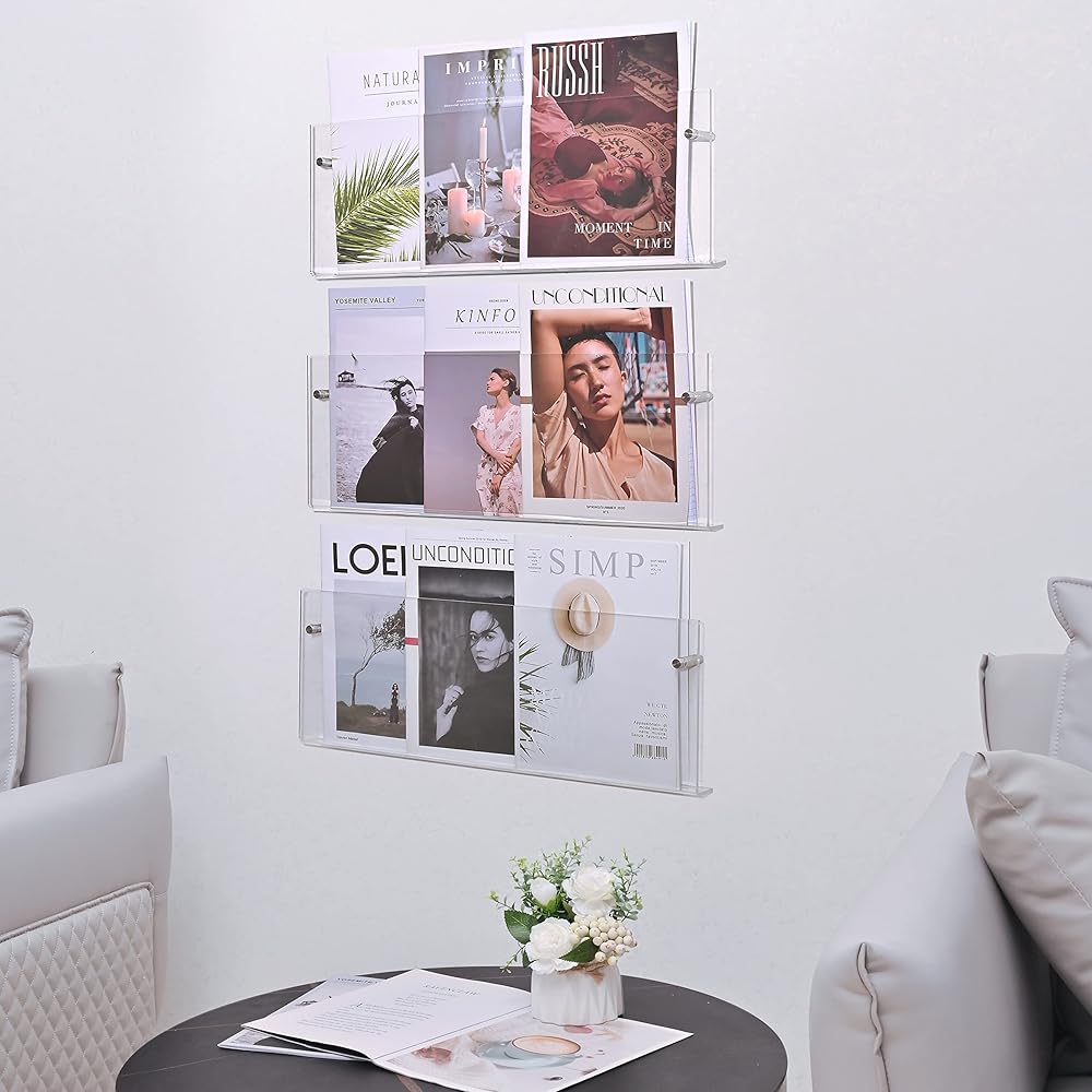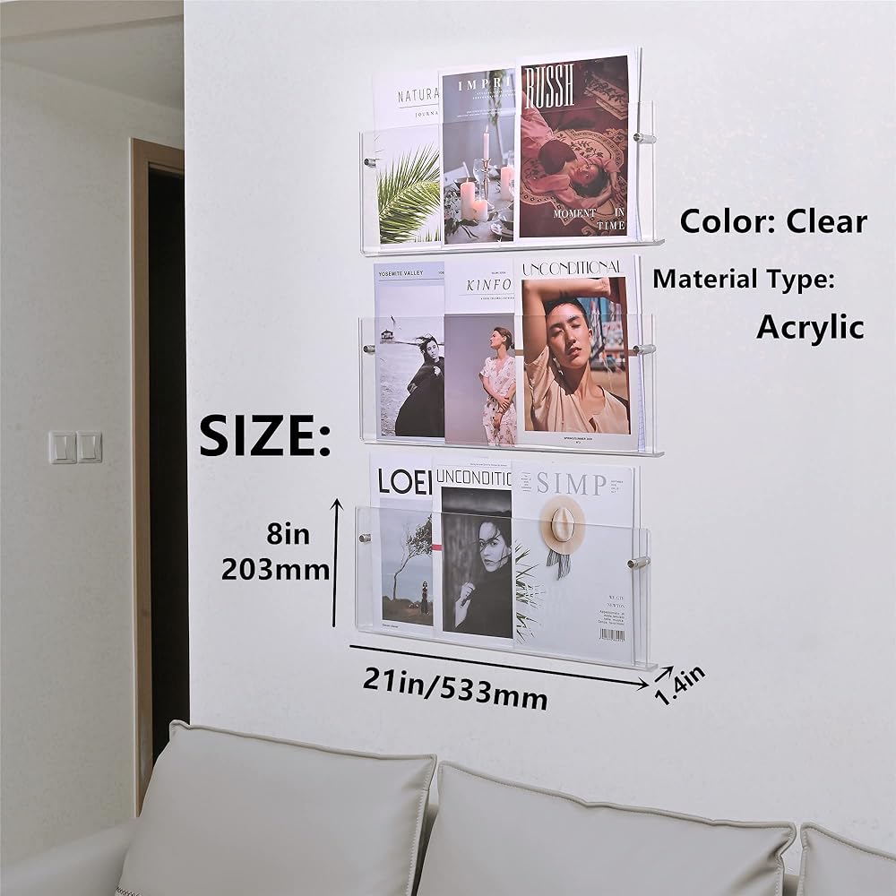 سهل التركيب: تم تجميع رف الحائط الخاص بالمجلات بالكامل. سوف تتلقى ثلاثة رفوف أكريليك ومسامير وتعليمات. يمكنك تثبيته على الحائط وفقًا للتعليمات. إنه سهل التثبيت في أي مساحة مفتوحة ولا يستغرق وقتًا طويلاً.