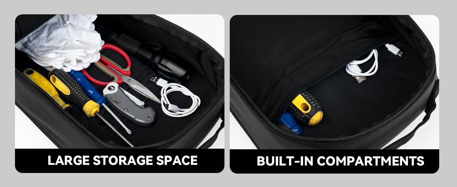 • تخزين واسع: تتميز حقيبة التخزين الخاصة بنا بمساحة رئيسية واسعة، وقد تم تصميمها لاستيعاب الأساسيات مثل النظارات الشمسية والمشروبات والقفازات والأدوات اللازمة لمغامراتك على الطرق الوعرة. بالإضافة إلى ذلك، تحافظ الطبقة البينية المدمجة على العناصر الصغيرة آمنة وتمنع فقدانها.