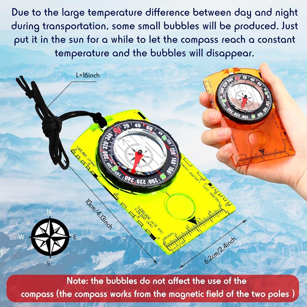 Reliable Material: map compass is made of acrylic, waterproof and wear resistant, proper for most weathers, which can serve you for a long time; Due to the large temperature difference between day and night during transportation, some small bubbles will be produced; Just put it in the sun for a while to let the compass reach a constant temperature and the bubbles will disappear; Note: the bubbles do not affect the use of the compass (the compass works from the magnetic field of the two poles)
