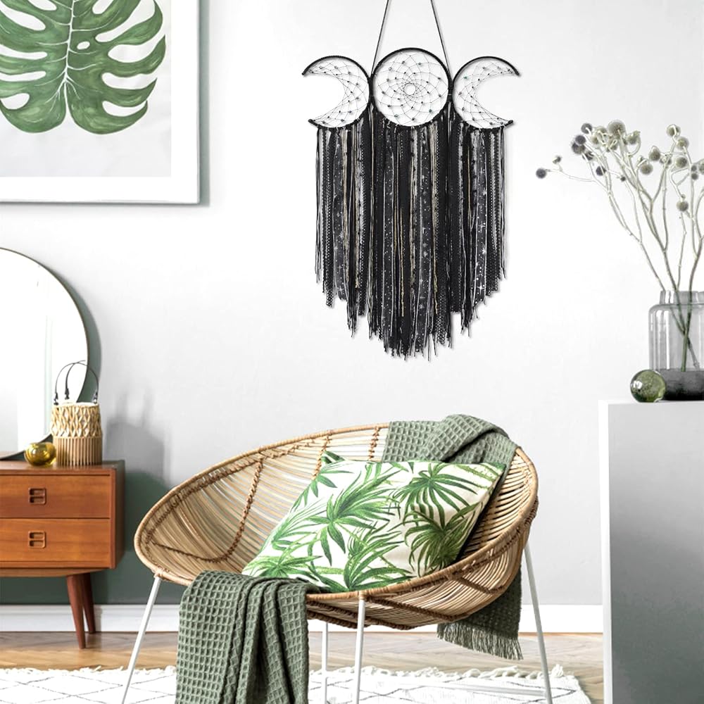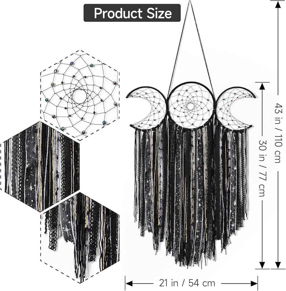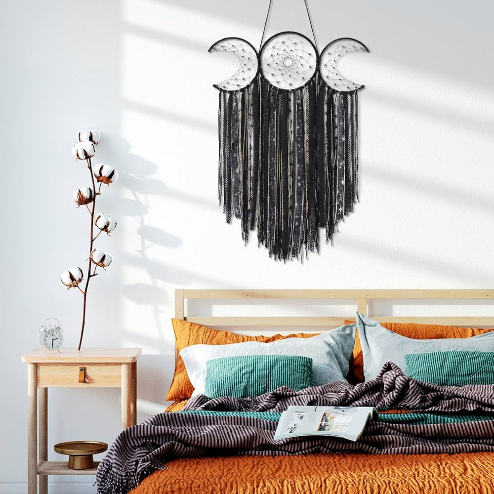 【صائدة الأحلام الكبيرة المصنوعة يدويًا】تتميز صائدة الأحلام لدينا بتصميم كبير الحجم، وهو أكبر بكثير من صائدة الأحلام العامة. يتم تشكيل كل مرحلة من مراحل القمر الثلاثة بشكل فردي وملفوفة يدويًا بخيوط قطنية متناسقة. ثم يتم ربطها معًا لتشكل رمز القمر الثلاثي. تصميم فريد من نوعه من الدانتيل من خيوط القطن، يمنح شعورًا أنيقًا بسيطًا، ويخلق شعورًا بالاسترخاء في الغرفة.