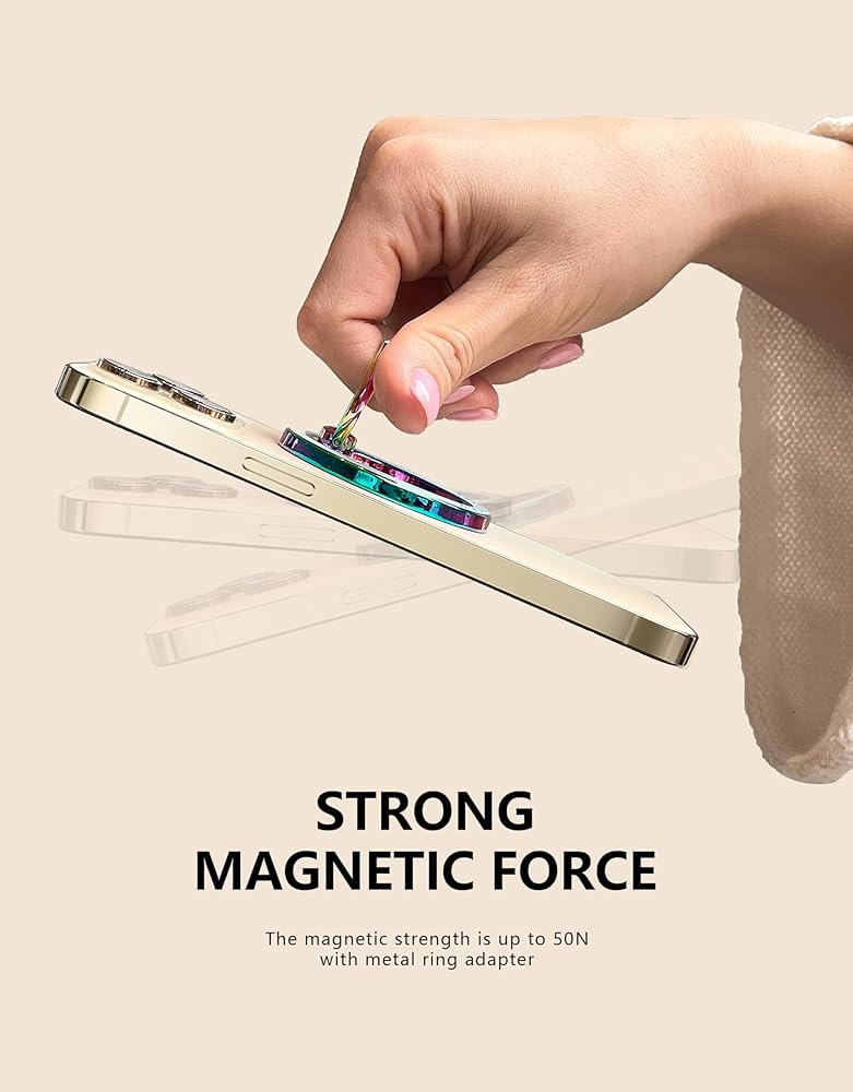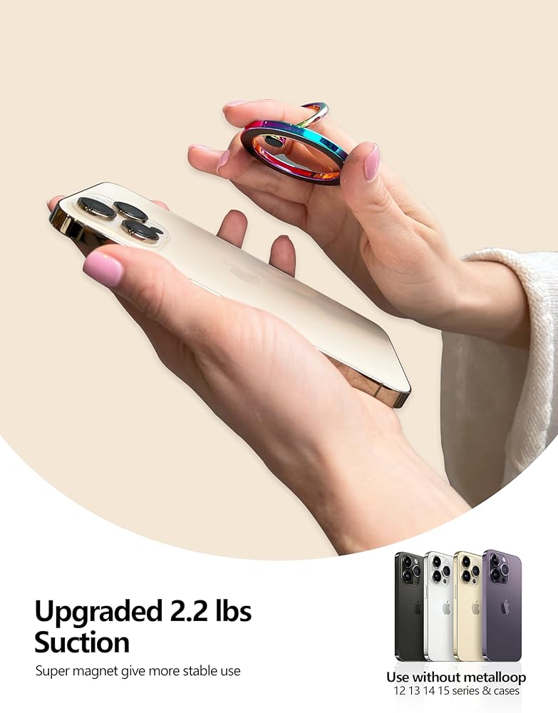 Strong magnetic force: With a magnetic force of up to 2.6lbs, this lightweight phone ring holder is powerful enough to keep bare iPhone 12, 13, 14 and 15 series securely attached, and up to 6.9lbs when used with the metal ring, providing users with even more security.