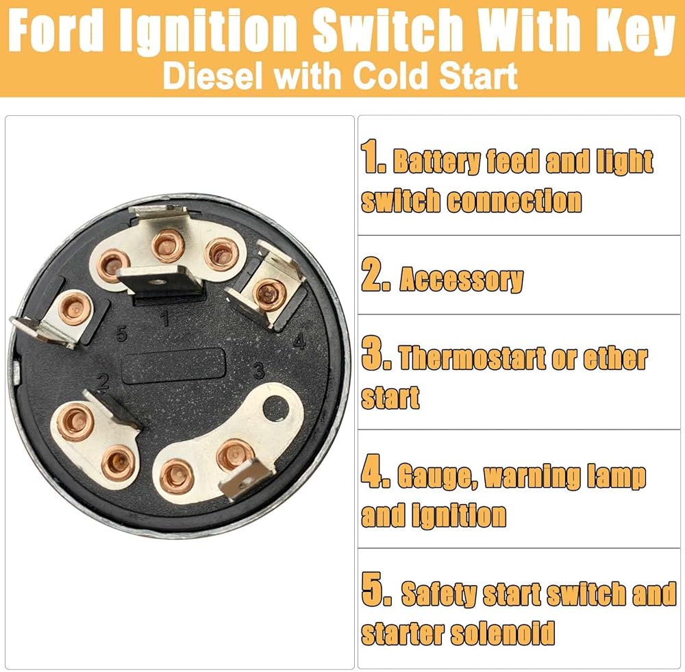 مفتاح الإشعال مع بداية باردة لجرارات فورد الديزل والجرافات الخلفية للودر '65 وما فوق؛ يحتوي مفتاح إشعال عربة الجولف على 5 أوضاع: الخطوة 0 - إيقاف التشغيل، الخطوة 1 - الملحقات، الخطوة 2 - الإشعال، الخطوة 3 - التسخين المسبق (الحرارة)، الخطوة 4 - البدء مع التسخين المسبق. الخطوتين 3 و4 محملتان بنابض.