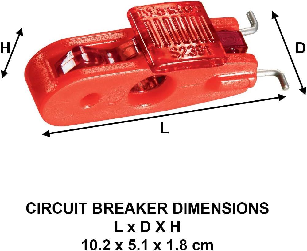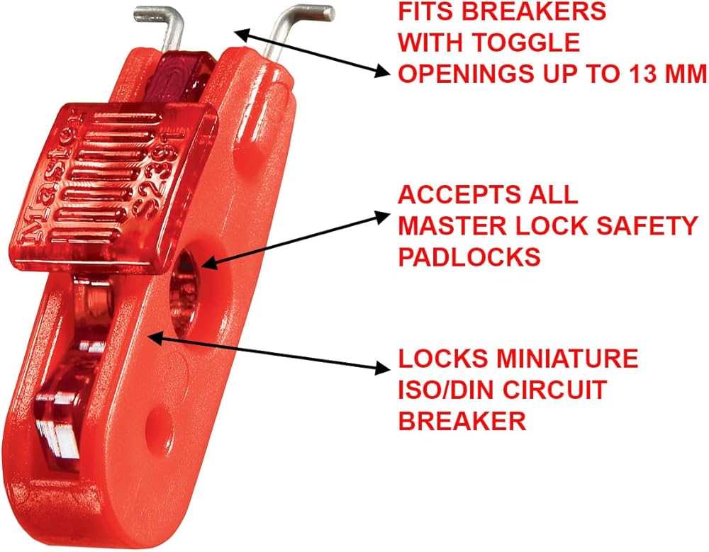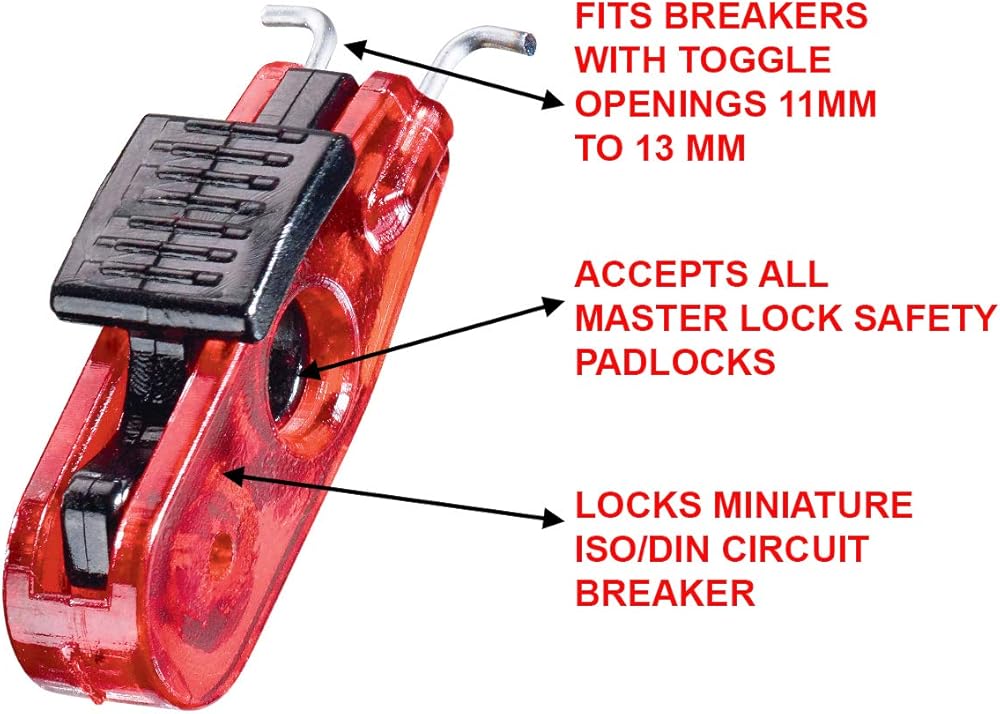 Master Lock S2391 Lockout Tagout Miniature Circuit Breaker Lockout will lock out most miniature ISO/DIN pin-out circuit breakers throughout the world. The patented device fits breakers with toggle openings 7/16 in. (11 mm) to 1/2 in. (13 mm) and works with all Master Lock and American Lock safety padlocks and most hasps (padlocks and hasps sold separately).
