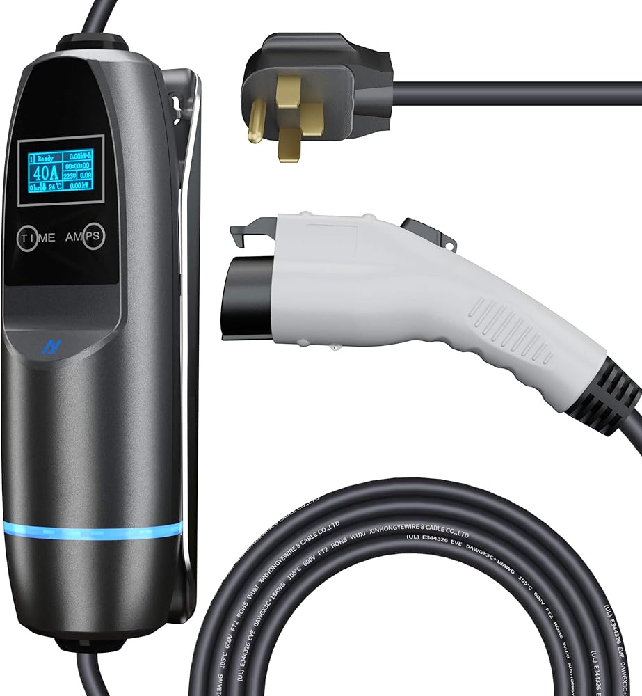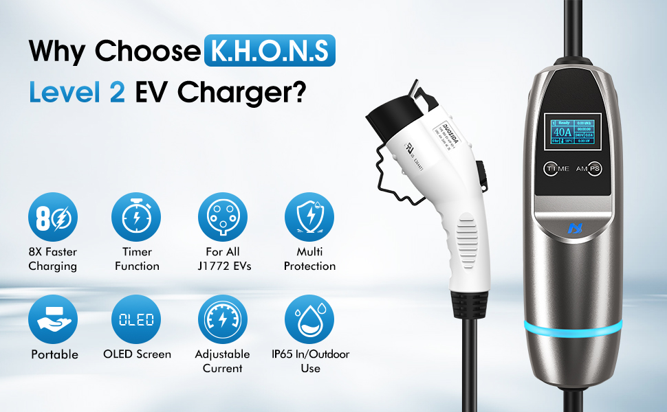 شاحن EV من المستوى 1 والمستوى 2 من KHONS، حتى 40 أمبير، كابل بطول 16.4 قدم، شاحن سيارة كهربائي محمول، ضبط وقت بدء الشحن، قابس NEMA 14-50، متوافق مع السيارات الكهربائية J1772، داخلي/خارجي (G2)