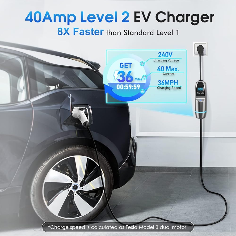 [سرعات شحن أسرع 8X] يوفر شاحن K.H.O.N.S المستوى 2 EV سرعات شحن أسرع 8X من الشاحن القياسي من المستوى 1. شاحن السيارة الكهربائية الخاص بنا قادر على توفير نطاق يصل إلى 36 ميلاً في الساعة من الشحن، مع خرج يصل إلى 9.6 كيلووات/40 أمبير، مما يدعم إعدادات التيار المرنة. يعتمد تيار العمل الفعلي على طراز السيارة. (سرعة الشحن تقريبية ويتم حسابها كمحرك مزدوج من طراز Tesla Model 3).