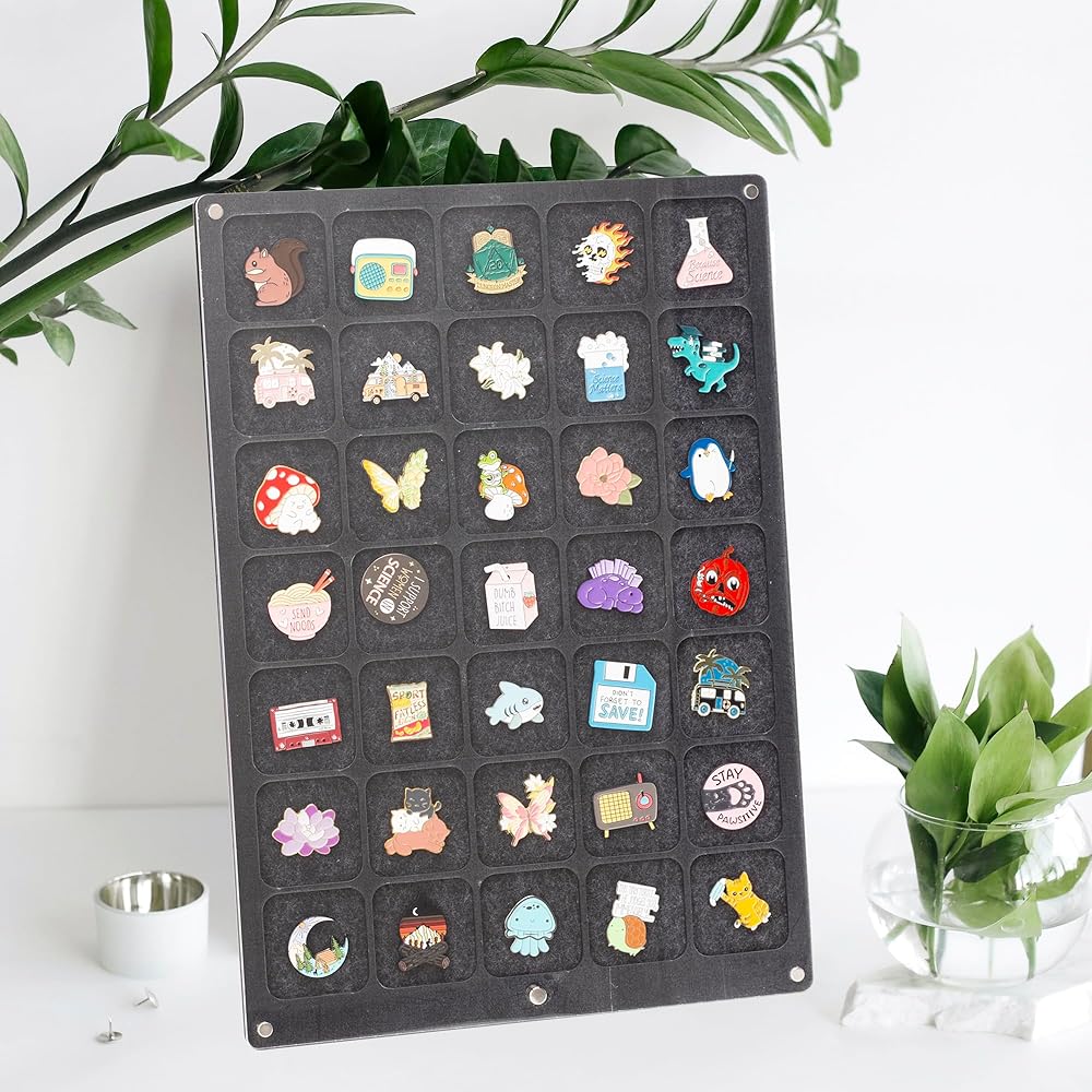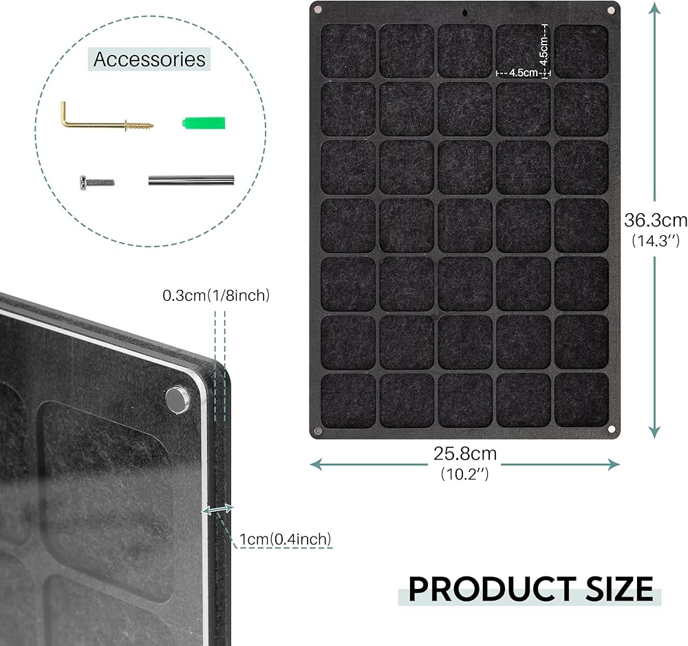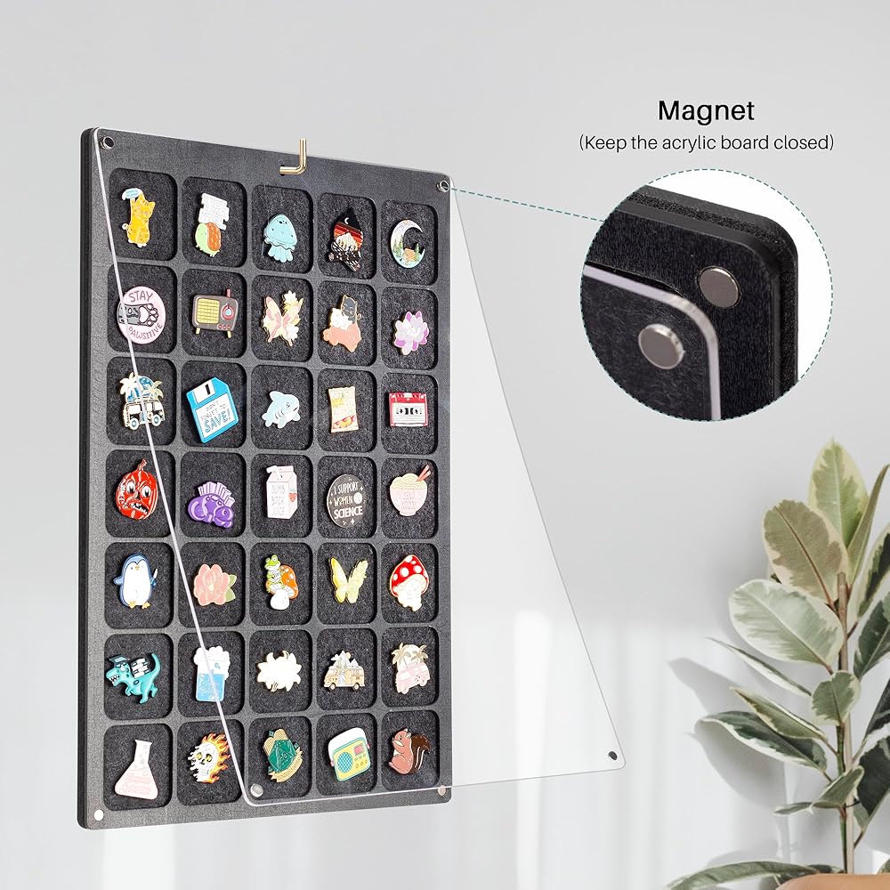 سعة تخزين كبيرة: 14.1 × 10.2 × 0.4 بوصة، مقسمة إلى 7 صفوف و5 أعمدة، يمكنها حمل 35 دبوسًا أو حلقًا أو دبابيس أو ميداليات أو شارات.