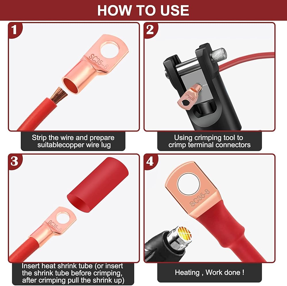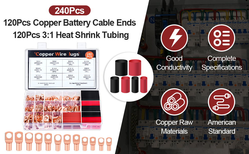مريحة للتنظيم: يوصى بالتحقق من أبعاد المنتج لضمان الملاءمة المناسبة قبل الاستخدام، كل عروة نحاسية عارية منقوشة بمقياس السلك الخاص بها، مما يسهل عليك إعادة تنظيمها بسرعة. يتم تخزين نهايات كابل البطارية مع مجموعات الانكماش الحراري في صندوق أدوات جميل وصغير الحجم، فلا تقلق بشأن مزجها معًا.