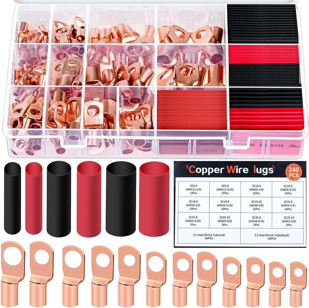 240 قطعة من عروات الأسلاك النحاسية مع مجموعة الانكماش الحراري AWG 2 4 6 8 10 12 مجموعة موصلات العروة الحلقية، سلك طرفي البطارية، 120 قطعة كابل عالي التحمل ينتهي 120 قطعة 3:1 أنابيب