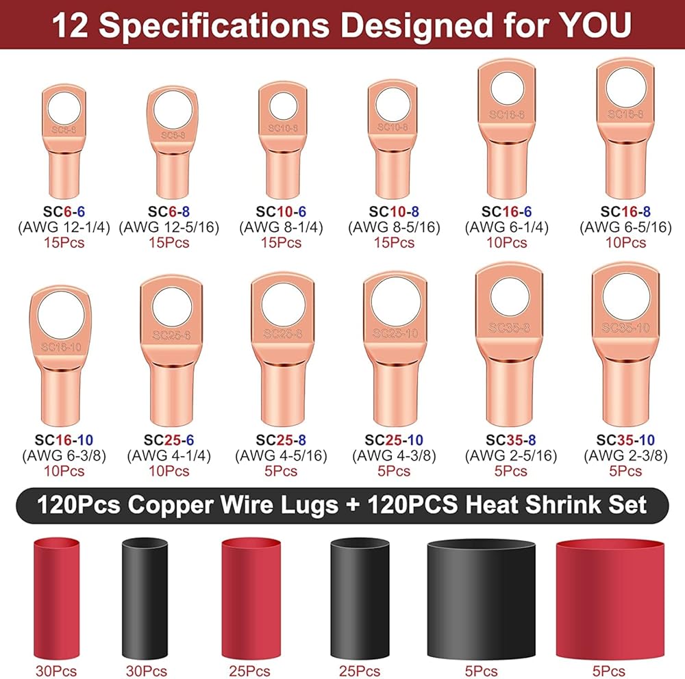 ما تحصل عليه: 12 نوعًا و120 قطعة من AWG 2 4 6 8 12 أطراف حلقة نهاية الأنبوب النحاسي، 3 مقاسات و3 ألوان 120 قطعة من أنبوب أنابيب الانكماش الحراري اللاصق المزدوج 3:1. يمكنك الاختيار بحرية من بين مجموعة متنوعة من الأحجام، حيث يمكن تجعيد الثقوب أو العروات النحاسية أو لحامها بالكابل.