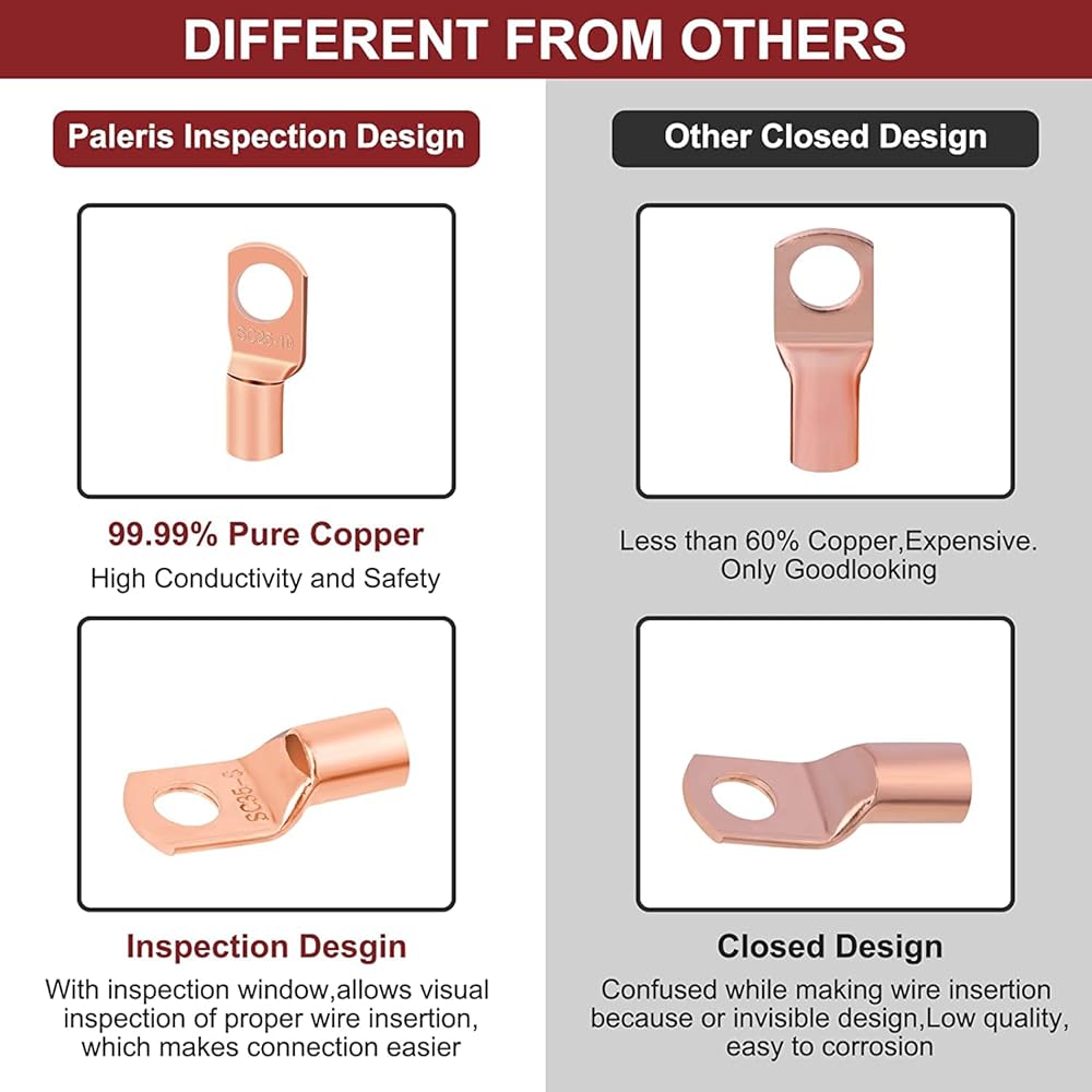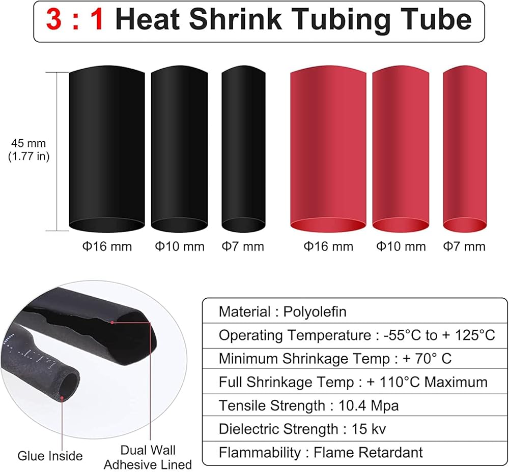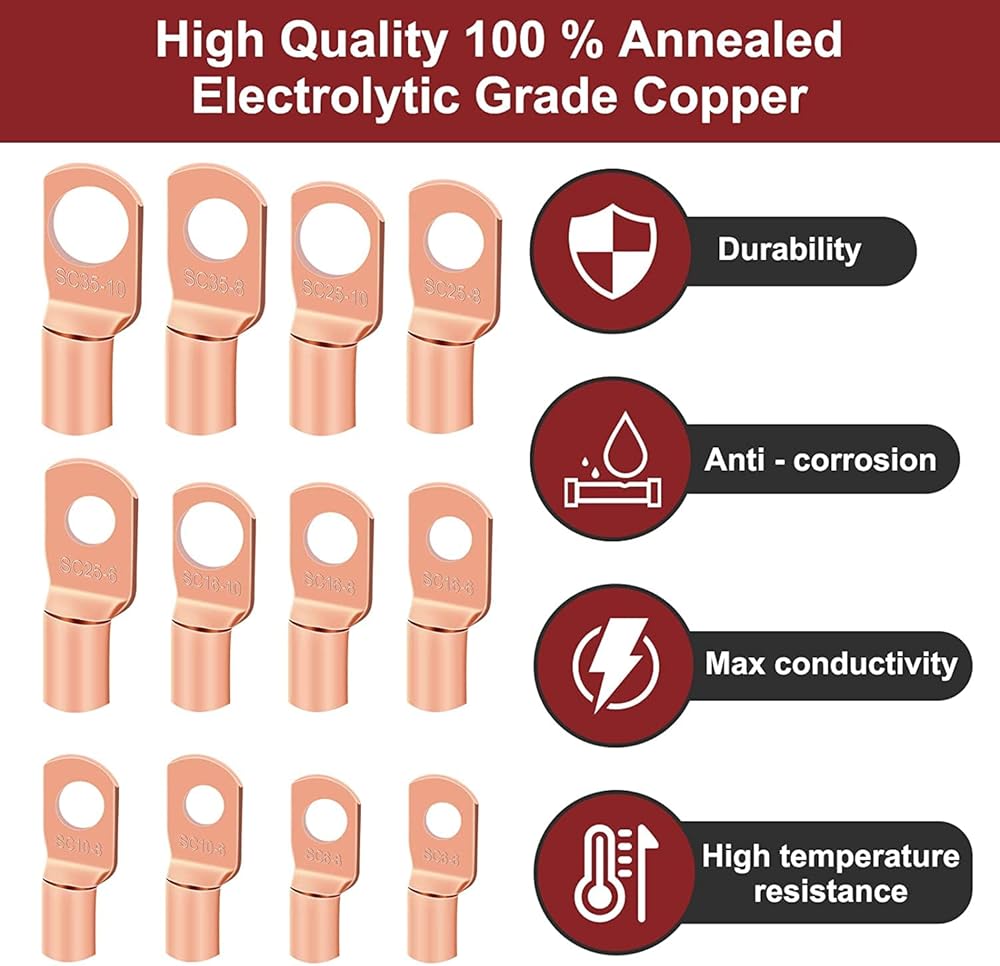 مواد ذات جودة: جميع أطراف الحلقة مصنوعة من النحاس الكهربائي بنسبة 100%، والذي يتمتع بأكبر قدر من التوصيل، والسطح مطلي بالقصدير لمنع التآكل. أنابيب الانكماش الحراري بنسبة 3:1 مصنوعة من مواد عالية الجودة. تصل طاقتها إلى 600 فولت، و257 درجة فهرنهايت، وكان الانكماش الحراري والمواد اللاصقة جيدة وسميكة ومتينة. تم اختبار كمية كبيرة من المواد لدينا واعتمادها من قبل UL، مما يضمن التشغيل الآمن على المدى الطويل للاستخدام المقصود.