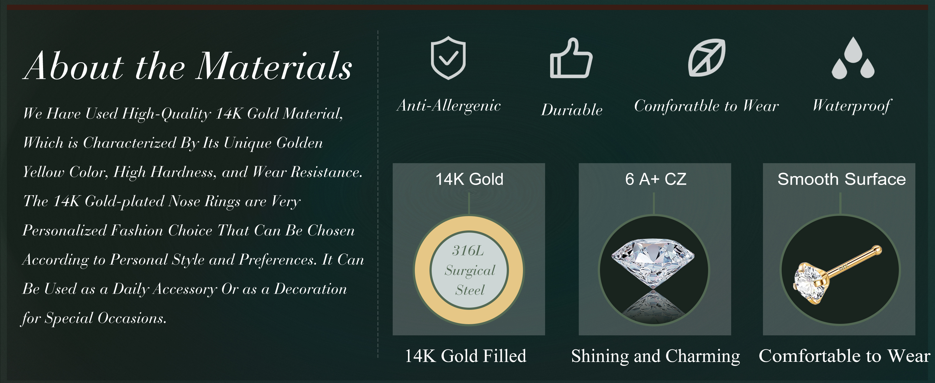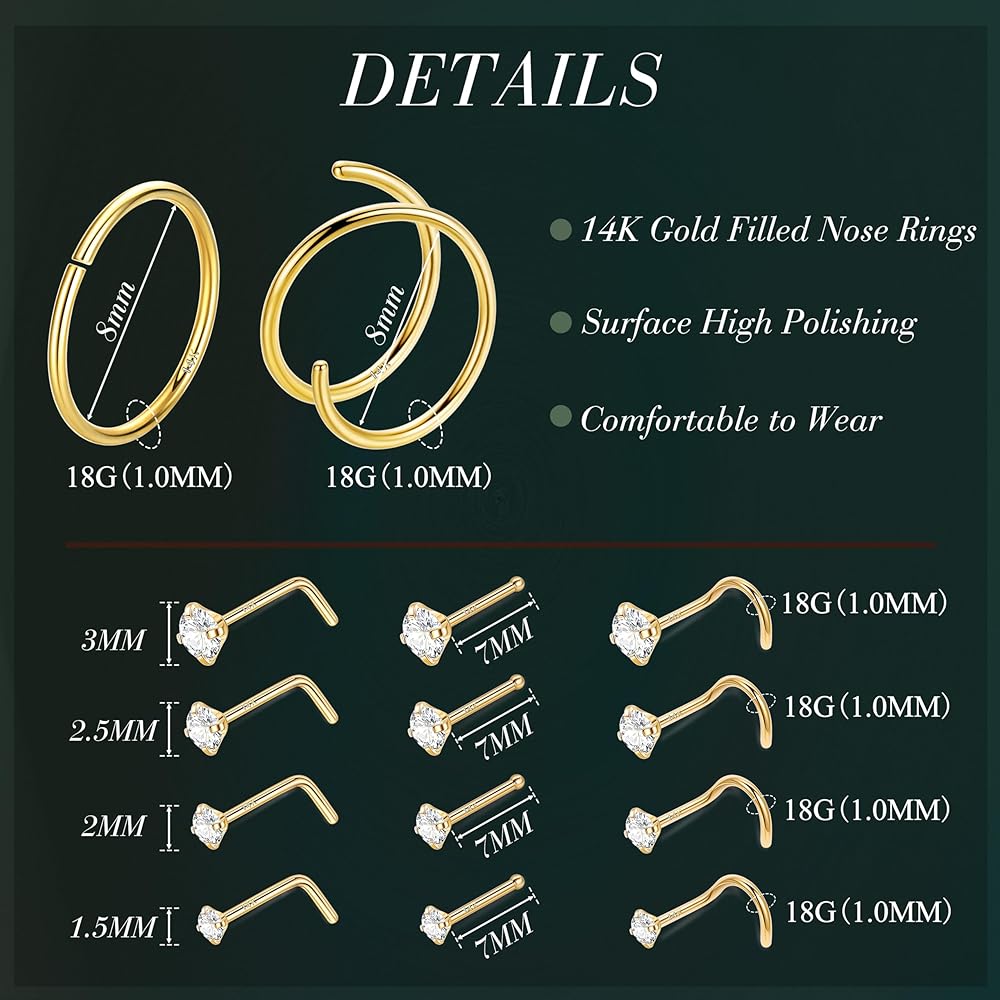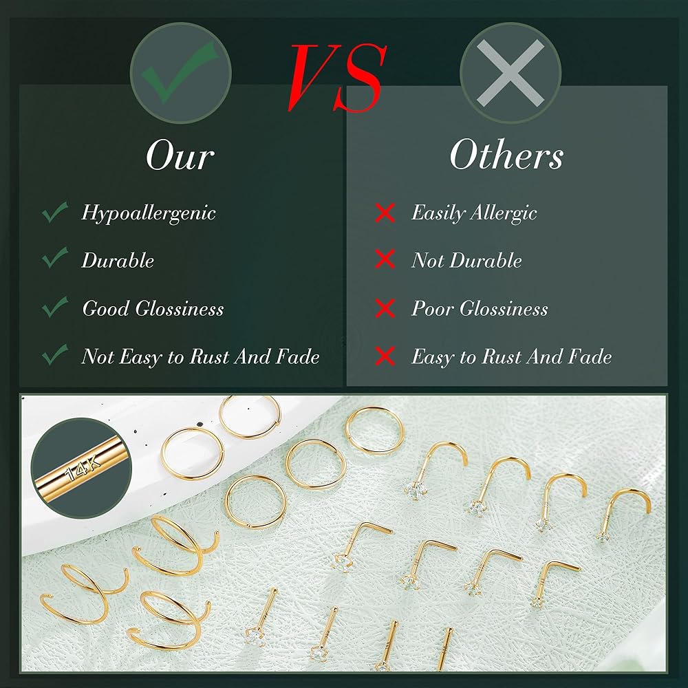 💗مسمار أنف ذهبي عيار 14 قيراط: حلقات الأنف مصنوعة من الفولاذ المقاوم للصدأ بدرجة 316L المملوء بالذهب عيار 14 قيراط، وهو خالي من الرصاص والنيكل. إنه متين ومضاد للحساسية، ويمكن اختياره من قبل الأشخاص ذوي البشرة الحساسة. جميع حلقات الأنف مصقولة يدويًا بدون حواف حادة ولن تخدش الجلد.