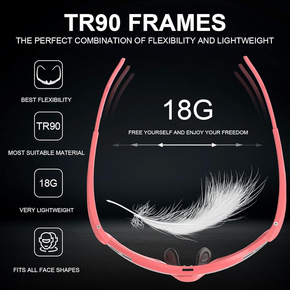• 【إطارات TR90 المقاومة للصدمات】 تعني أنماط الحياة النشطة أن نظارتك الشمسية الرياضية يجب أن تكون قوية وقوية بما يكفي للتعامل مع أي تحديات تواجهها. إطار TR90 المصمم خصيصًا والمقاوم للضغط قوي وخفيف للغاية، ويزن 18 جرامًا فقط. تتيح لك نسيان ارتدائها أثناء ممارسة الرياضة.