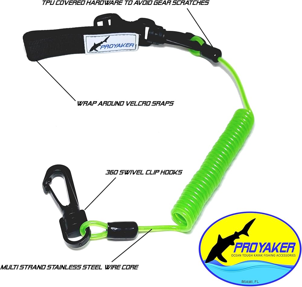 Unique inner stainless steel multi-strand coil, combined with a layer of sun resistant exterior TPU layer and double reinforce poly-carbonate swivels Hook clips on each side, is what makes the PROYAKER leash the best in the industry. Designed by offshore kayak fishermen, the leash has been tested under the most demanding conditions. Expanding to 5' the leash gives you enough space to move your fishing rod around your vessel with ease. Whether you are fishing from a kayak, a boat or pier, you can be sure that the PROYAKER leash will keep your rods or gear secured at all times.