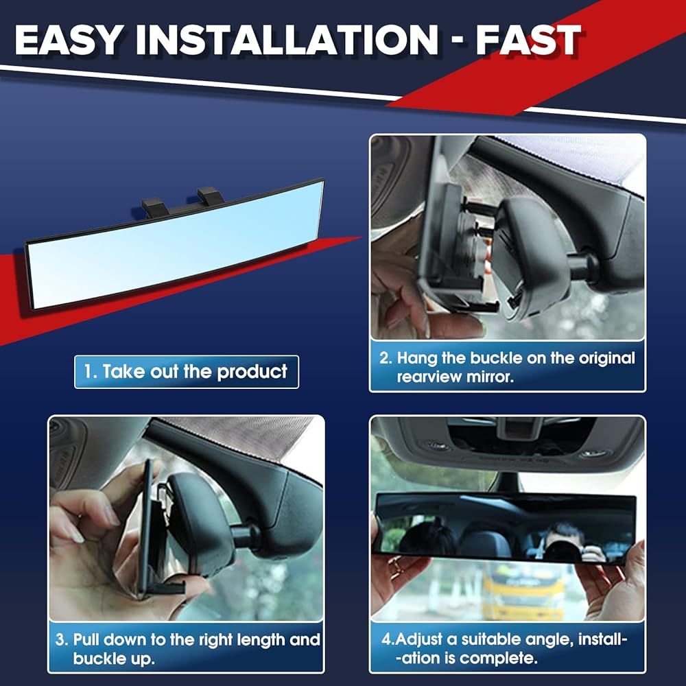 【سهلة التركيب】لا حاجة لأي أدوات، فقط قم بتثبيت المشبك القابل للتعديل على الجزء الخلفي من المرآة إلى الجزء السفلي من المرآة الأصلية وضبط الزاوية، واحرص على عدم الضغط بقوة على المرآة.