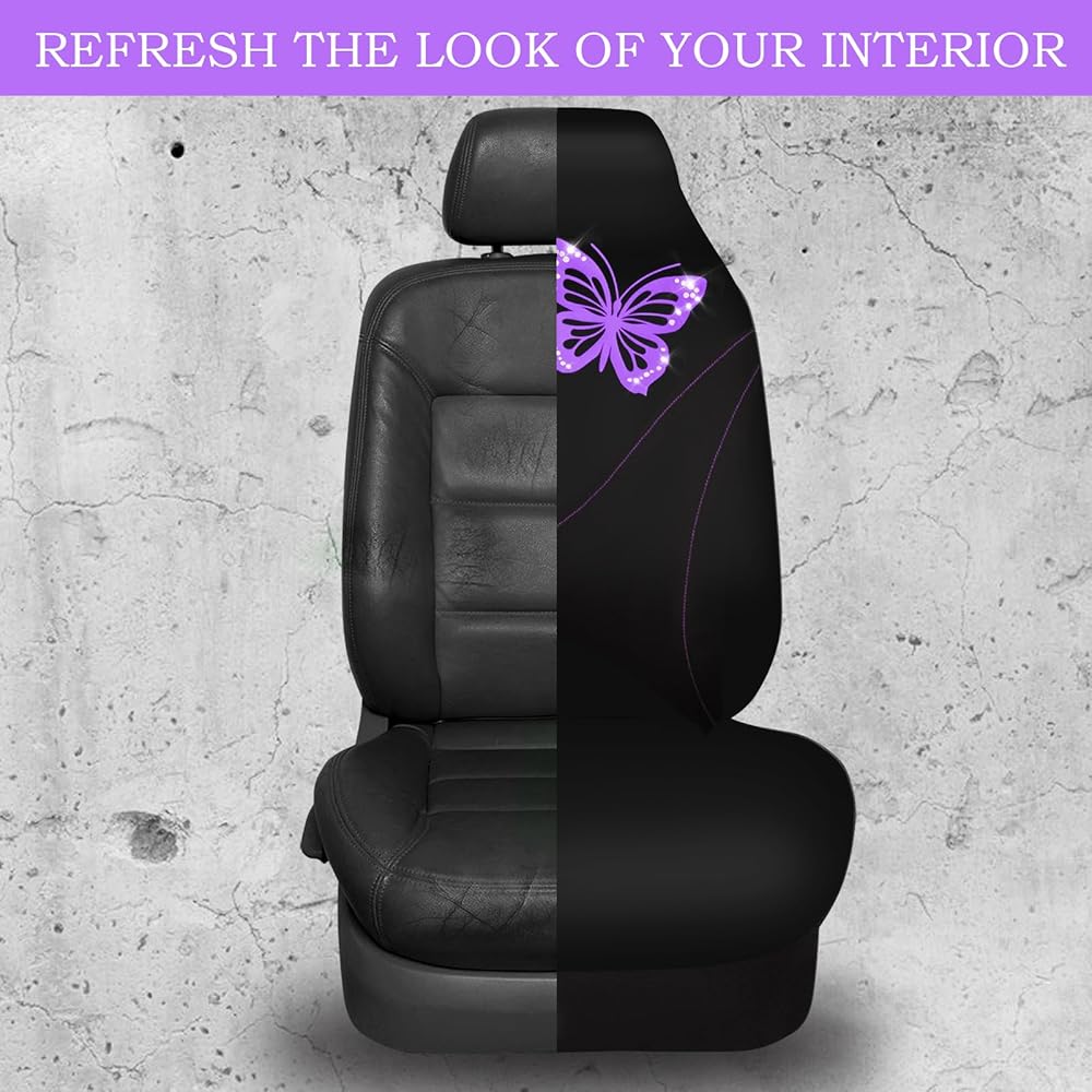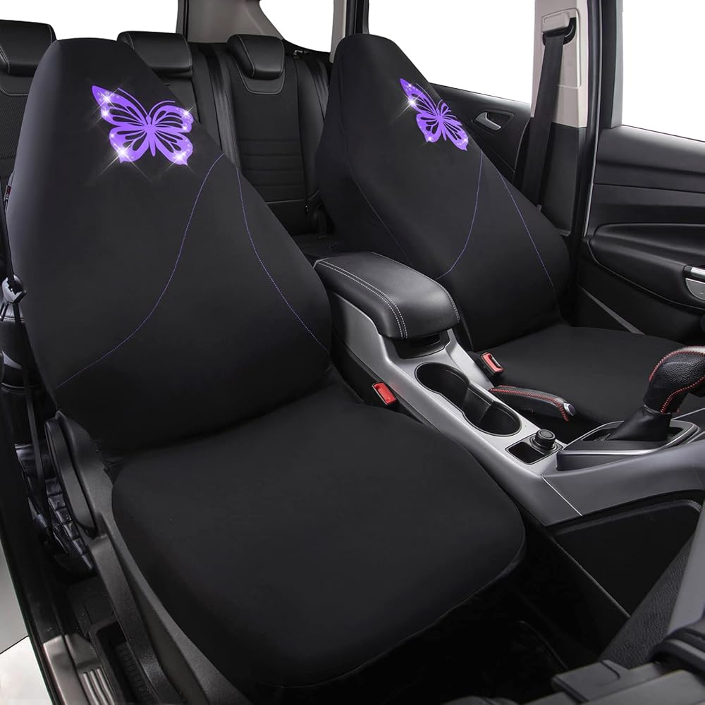 أغطية مقاعد السيارة CAR-GRAND Bling Butterfly، أغطية مقاعد أمامية على شكل فراشة أرجوانية لطيفة، متوافقة مع الوسائد الهوائية، سيارات السيدان والسيارات والشاحنات الصغيرة، مناسبة للنساء والفتيات (أرجواني مع أسود)