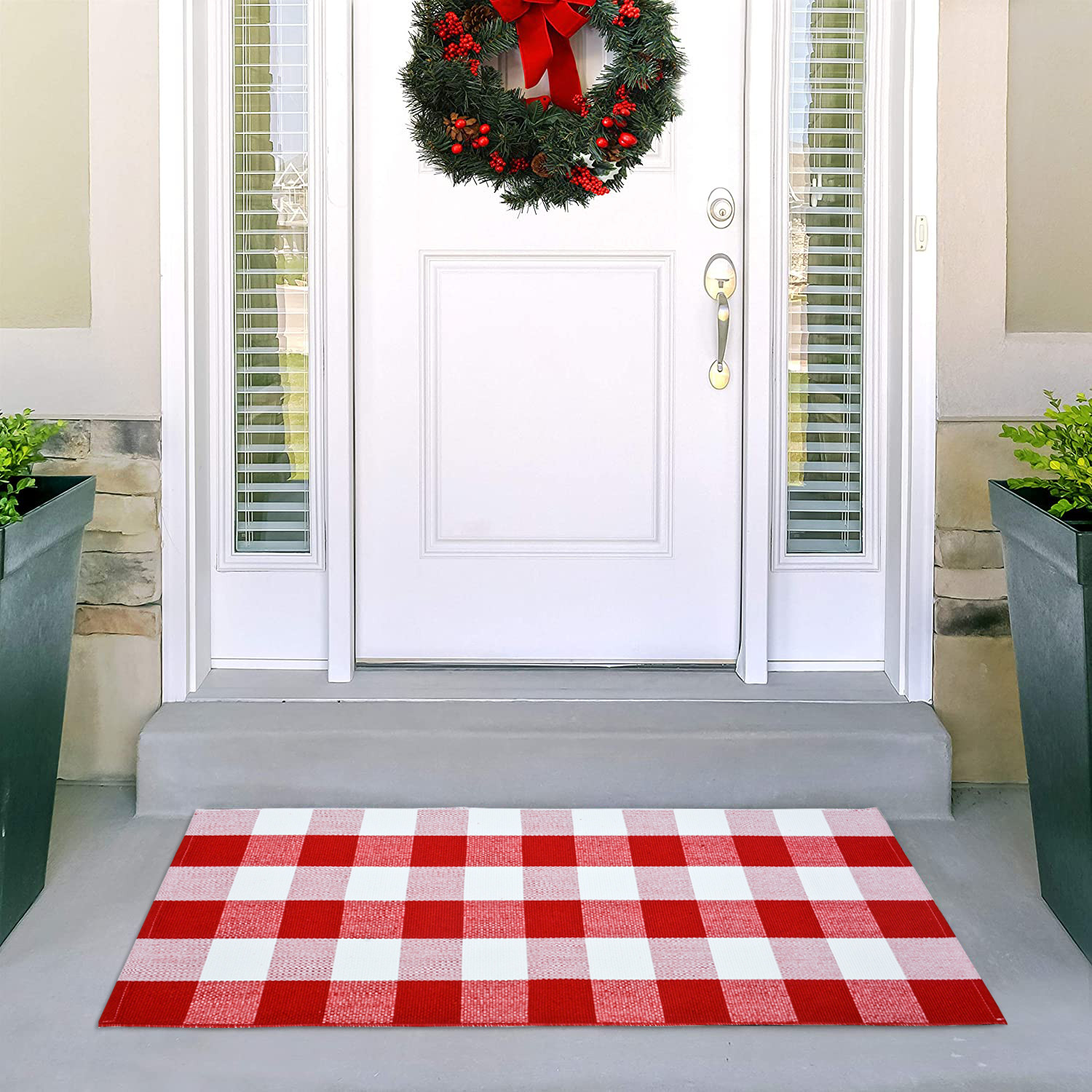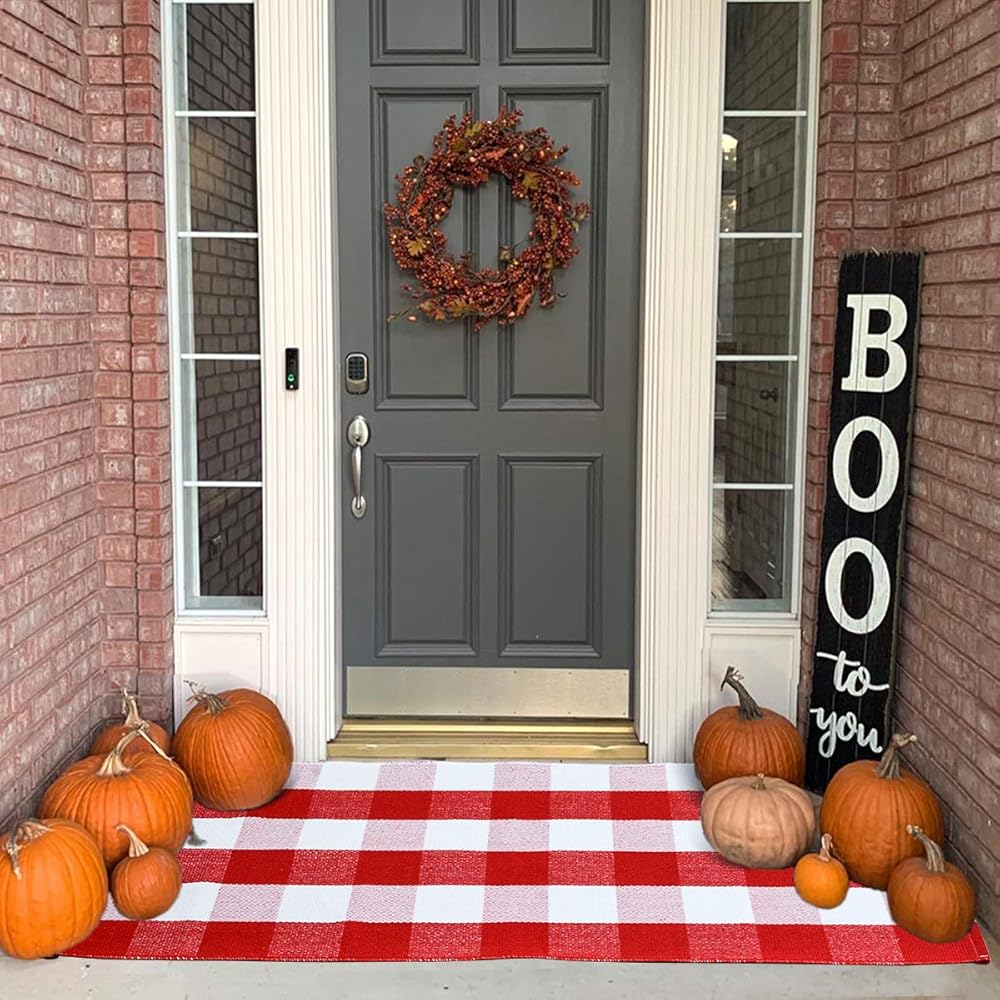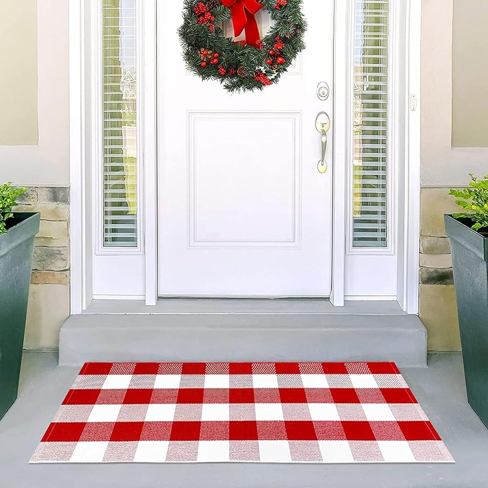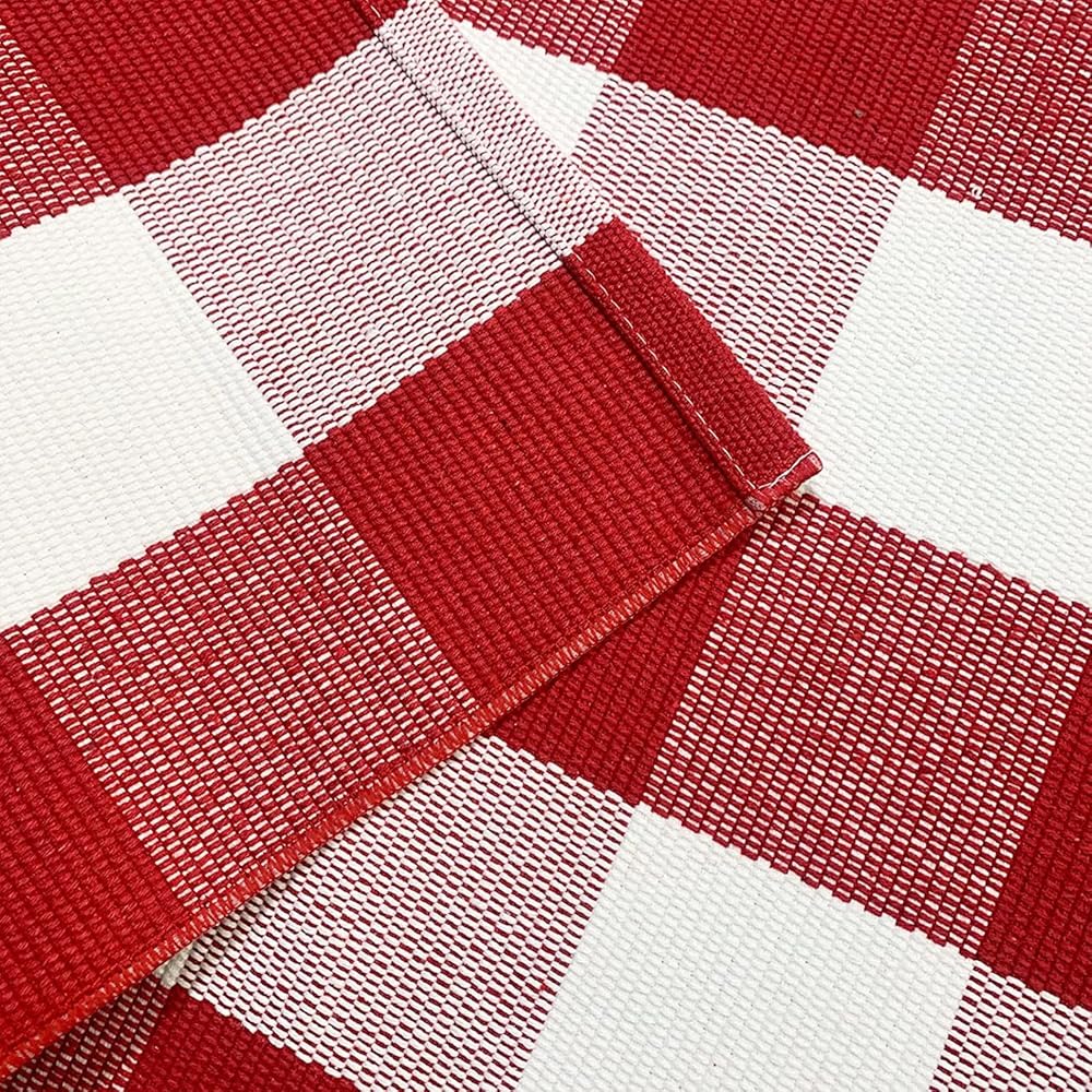 • ★ 〖ناعمة ومتينة〗: سجادة خارجية مصنوعة من قطن عالي الجودة ناعم ومريح عند اللمس. سجادة باب رائعة منسوجة يدويًا مصنوعة من نمط مربعات باللون الأحمر والأبيض ونسيج صديق للبيئة