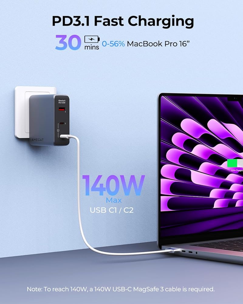 شاحن فائق السرعة: استمتع بالشحن بسرعة البرق مع شاحن AMEGAT 140 واط. تم تصميمه باستخدام بروتوكول PD3.1 المتطور، حيث يوفر منفذ USB-C واحد قوة هائلة تبلغ 140 وات لجهاز MacBook Pro 16 الخاص بك، ويشحنه بما يصل إلى 56% خلال 30 دقيقة فقط. (ملاحظة: استخدم USB-C لشحن Magsafe 3 الكابل، غير متضمن.)