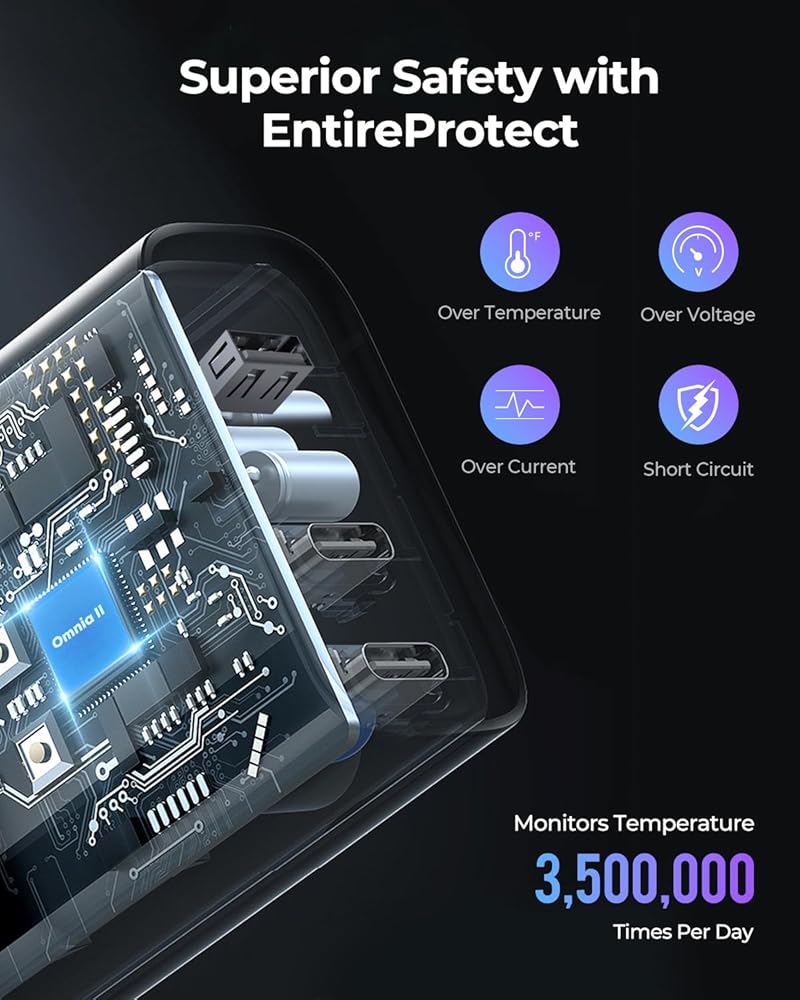حماية متينة وكاملة: مراقبة درجة الحرارة في الوقت الحقيقي، أكثر من 3,500,000 عملية مسح لدرجة الحرارة يوميًا وحماية مدمجة من الجهد الزائد والتيار الزائد وقصر الدائرة. يقوم نظام الشحن الذكي Omnia 2.0 المحسن بضبط تيار الشحن بذكاء للأجهزة المختلفة، مما يمنحك تجربة شحن أسرع وأكثر أمانًا.