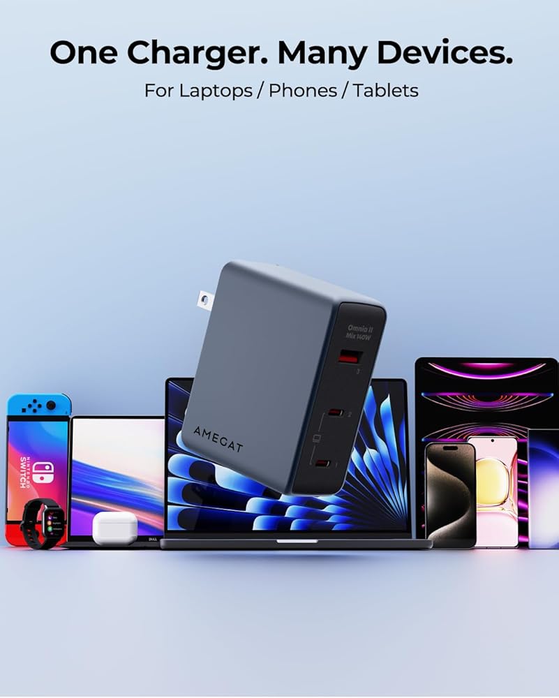 توافق واسع: شاحن AMEGAT 140W متوافق مع أجهزة MacBook Pro 16، 15، 14، 13 بوصة، MacBook Air، Dell XPS 15/13، HP Spectre/HP Chromebook، iPad Pro، iPhone 15 Pro/14 Pro Max/13/12، Galaxy S24+/S24 Ultra/S23/S22، وSwitch، وSteam Deck، والمزيد؛ يدعم بروتوكول الشحن فائق السرعة 2,0 من سامسونج؛ لا يمكن شحن سلسلة أجهزة الكمبيوتر المحمول من Dell بالسرعة الكاملة بسبب قيود بروتوكول الشحن.