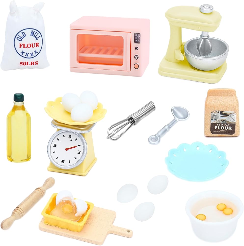 Package includes: You will receive total 26 pieces kitchen accessories for making cake ingredients, including 1 stand mixer set, 1 kitchen scale set, 1 flour, 7 eggs with 1 basket, 1 chopping board, 1 rolling pin, 1 whisk, 1 olive oil, 1 bowl with 3 eggs and 1 oven set. All of miniture house furniture doesn't need assembled.