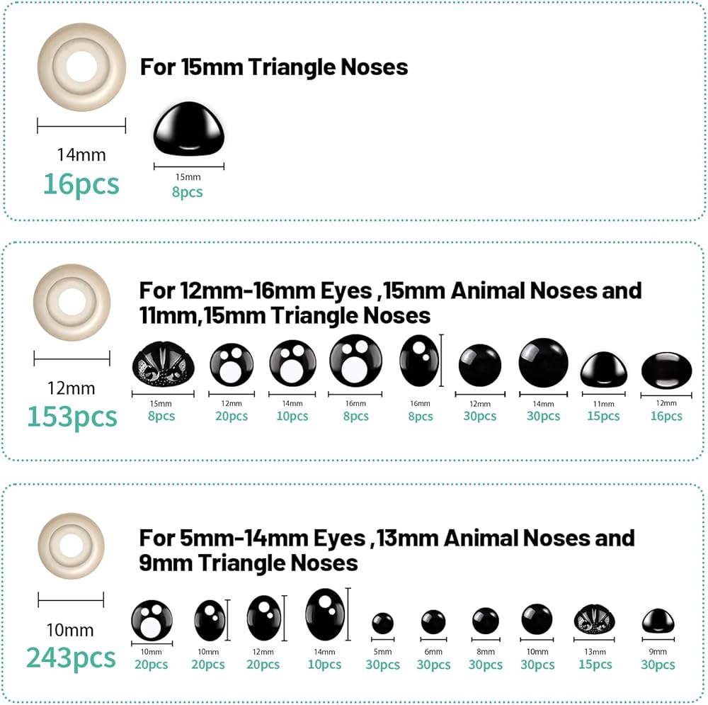 【عبوة قيمة】صندوق واحد إجمالي 800 قطعة، بما في ذلك غسالة 412 قطعة. عيون أمان وأنوف آمنة 388 قطعة، (العيون والأنف: 5 مم، 6 مم، 8 مم، 9 مم، 10 مم، 11 مم، 12 مم، 13 مم، 14 مم، 15 مم، 16 مم)، يمكن أن تناسب أحجام وأنماط العيون المختلفة احتياجاتك الواسعة.