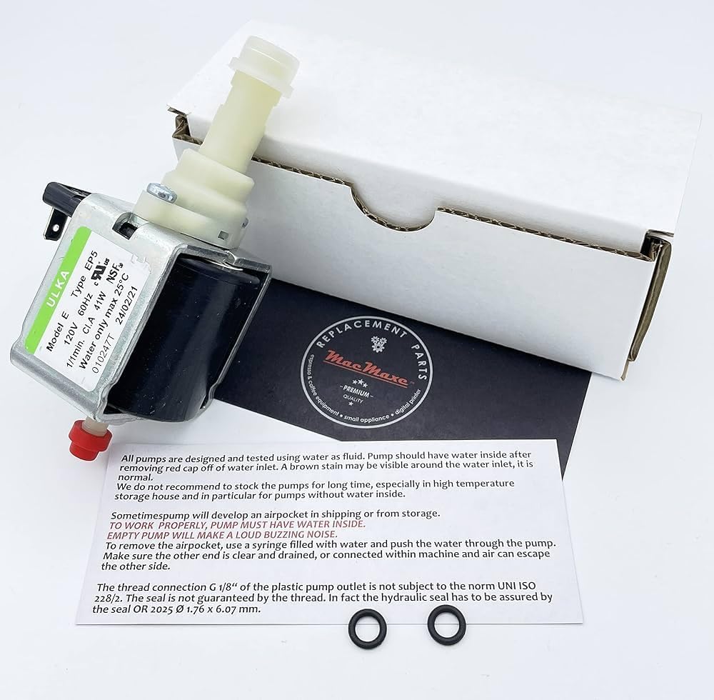 MacMaxe ULKA Model E Type EP5 - مضخة مياه اهتزازية بملف لولبي مزودة بختمين أو 2025 - تشغيل/إيقاف 1/1 دقيقة، 120 فولت 60 هرتز 41 وات - توافق واسع مع ماكينات الإسبريسو (EP5)