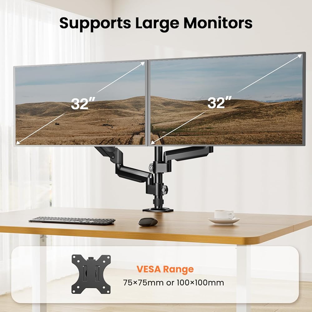 يحمل شاشات كبيرة مقاس 32 بوصة: يتوافق حامل الشاشة المزدوج للمكتب مع معظم الشاشات المسطحة أو المنحنية حتى 32 بوصة مع أنماط التركيب 75 × 75 أو 100 × 100 مم. لتأكيد التوافق، يرجى التحقق من حجم الشاشة ووزنها ونمط تركيب شاشتك وفقًا لمعايير VESA قبل الشراء.