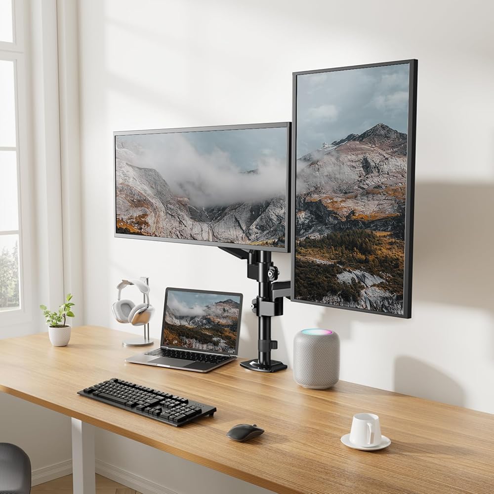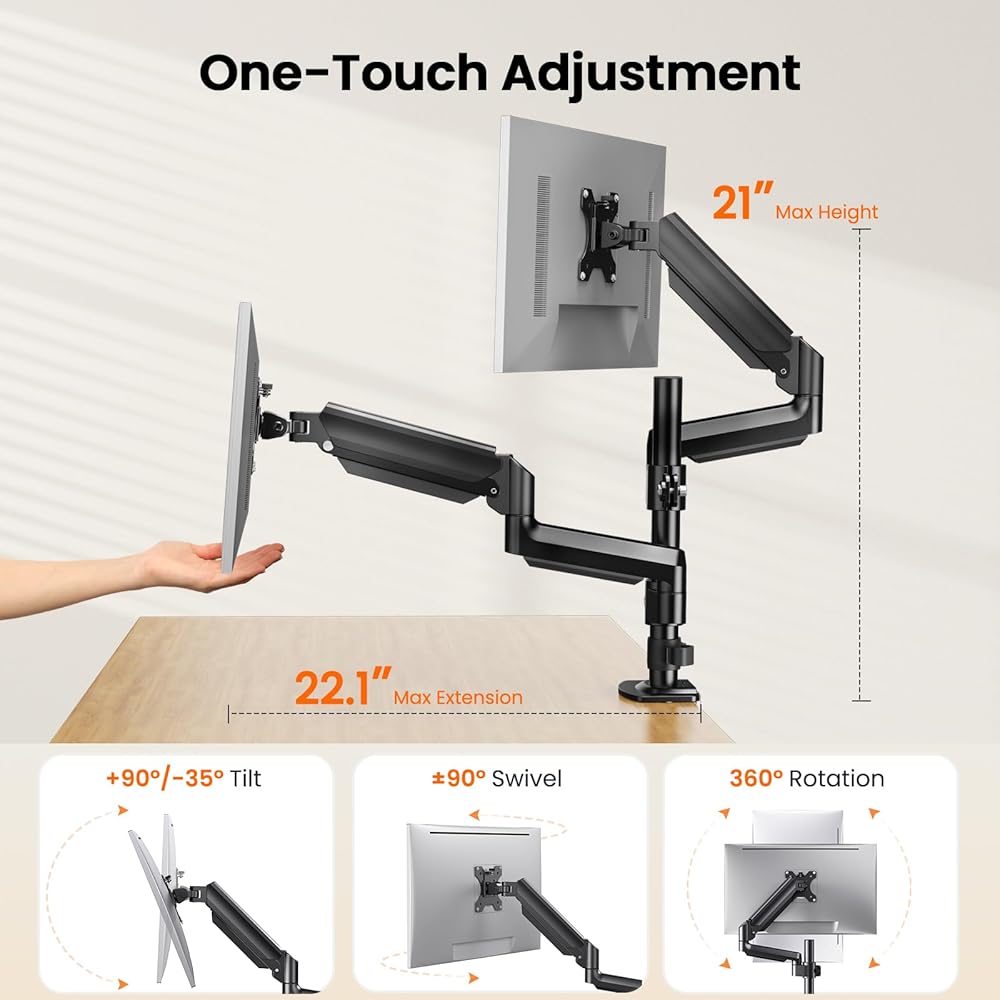 تجربة عرض محسنة: يتميز حامل الشاشة المكدس الخاص بنا بإمالة +90 درجة/-35 درجة لوضع كل شاشة بسهولة في زاوية الرؤية المثالية. قم بتمديد الشاشات إلى الخارج بمقدار 22.1 بوصة لمشاهدة أقرب أو تدويرها +/-90 درجة لسهولة مشاركة الشاشة. يتيح لك الدوران بزاوية 360 درجة اختيار الوضع الرأسي لعرض المستندات الطويلة أو ممارسة الألعاب الرأسية بسهولة.