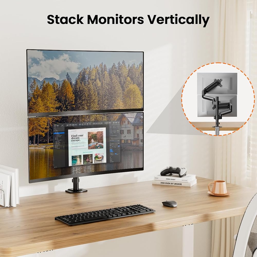 قم بتكديس شاشاتك: بالمقارنة مع حوامل الشاشات الرأسية الشائعة، يتميز حامل الشاشة VESA الخاص بنا بعمود طويل يبلغ 13 بوصة، مما يجعل من الممكن تكديس شاشتين مقاس 32 بوصة عموديًا لتوفير المساحة. مع أقصى ارتفاع للذراع يبلغ 21 بوصة، لديك مرونة إضافية لوضع شاشتك للحصول على راحة مريحة، مما يساعد على تقليل الضغط على رقبتك وظهرك.