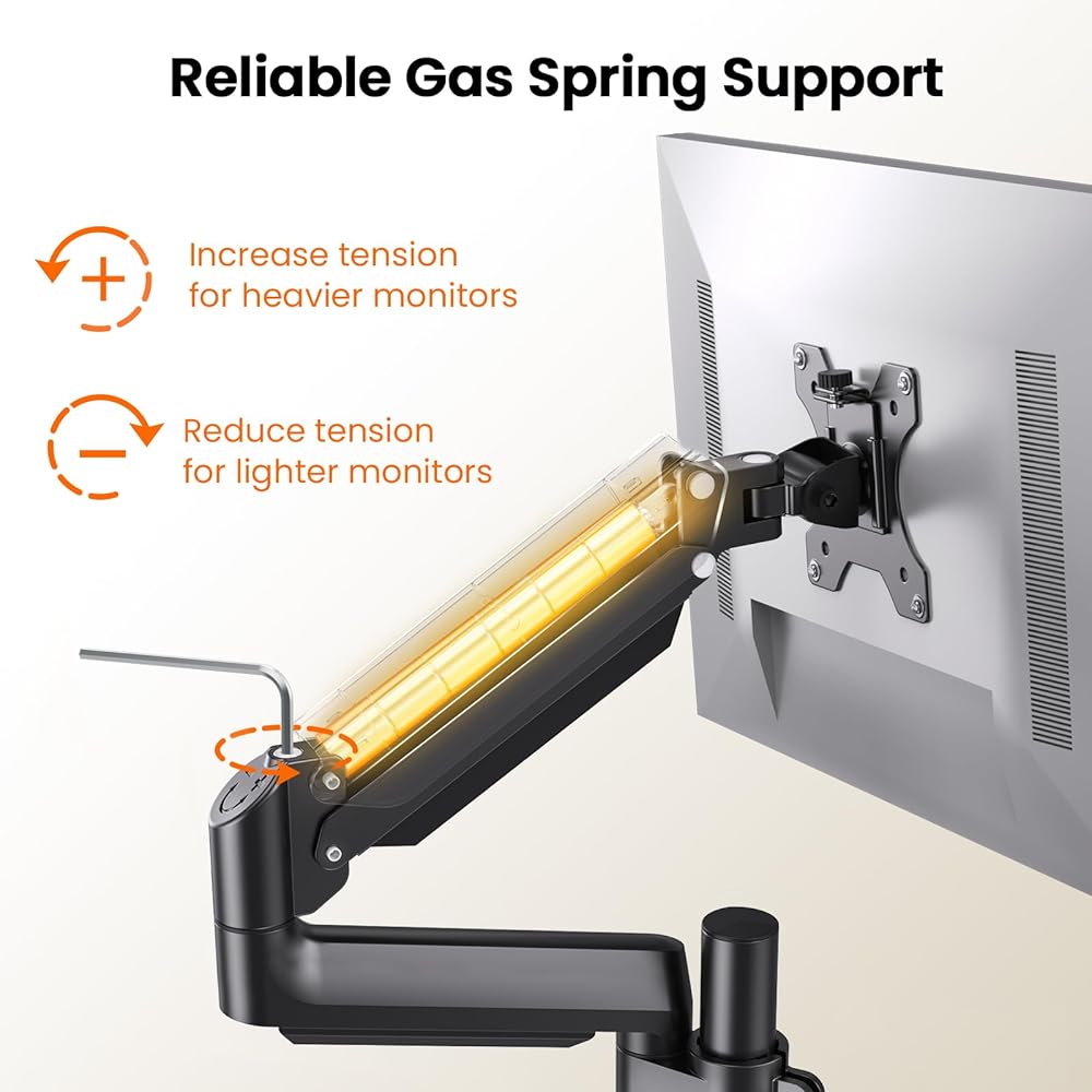 دعم قوي ومستقر: مصنوع من سبائك الألومنيوم المستخدمة في مجال الطيران والفضاء والفولاذ القوي المدلفن على البارد، يمكن لكل ذراع من حامل الشاشة المزدوج هذا أن يدعم ما يصل إلى 19.8 رطلاً لتعزيز الثبات. اعمل أو العب بثقة مع العلم أن شاشتك مثبتة بشكل آمن على حامل المكتب هذا.