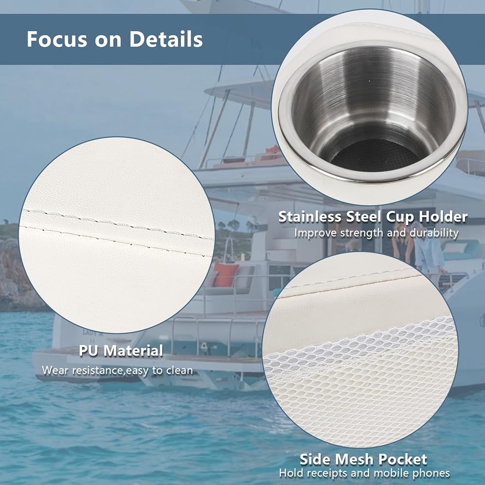 【Premium Material】Pontoon cup holder is crafted with grade PU leather,smooth surface, not easy to absorb dust or stains, with good wear resistance and waterproof performance, not easy to wear or crack, can maintain a beautiful appearance for a long time.The interior of pontoon boat cup holders is filled with high-resilience qualitative sponge, which is not easy to deform and has a longer service life.Drink holder is made of stainless steel to improve its strength and sturdiness.
