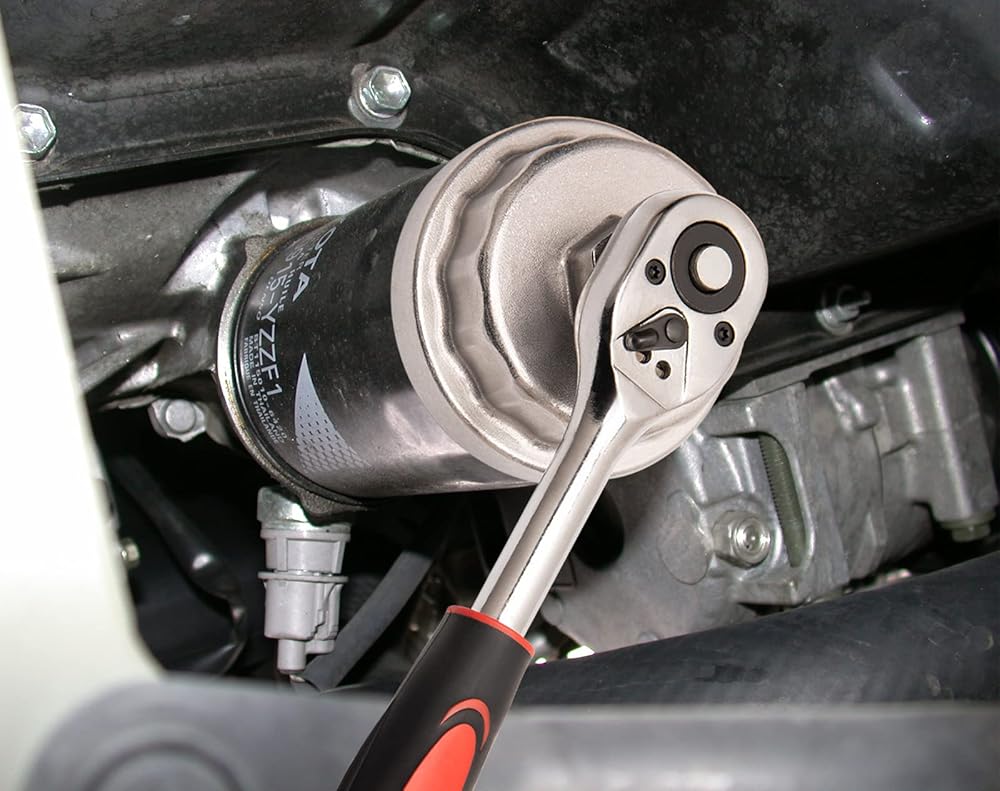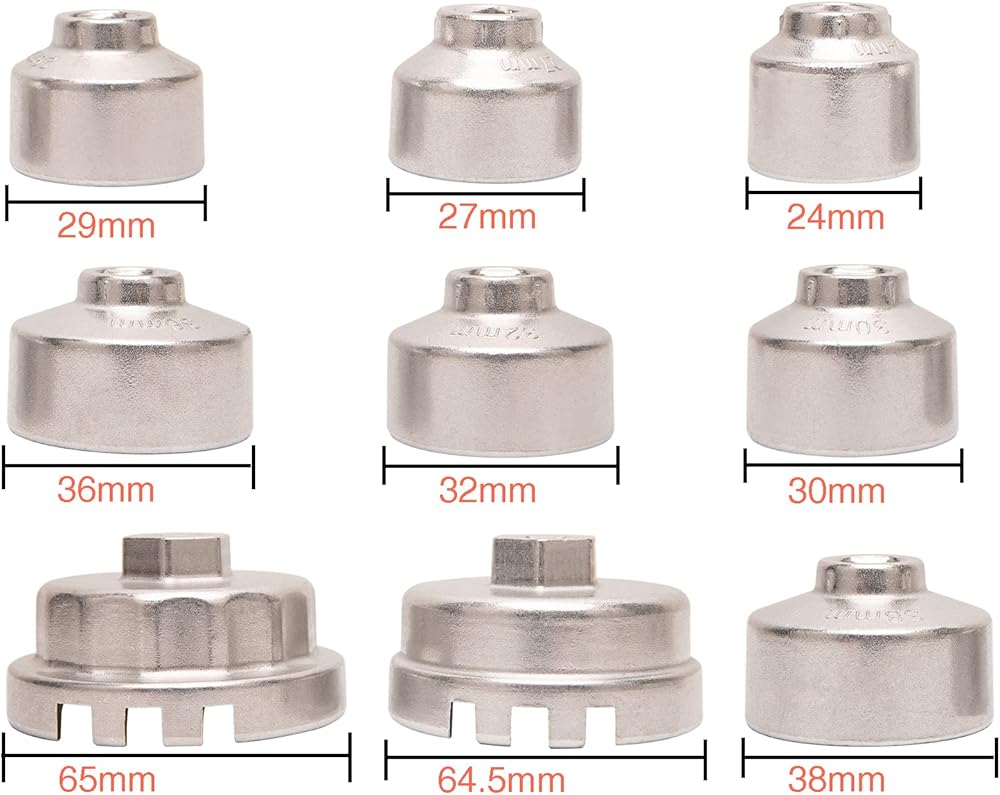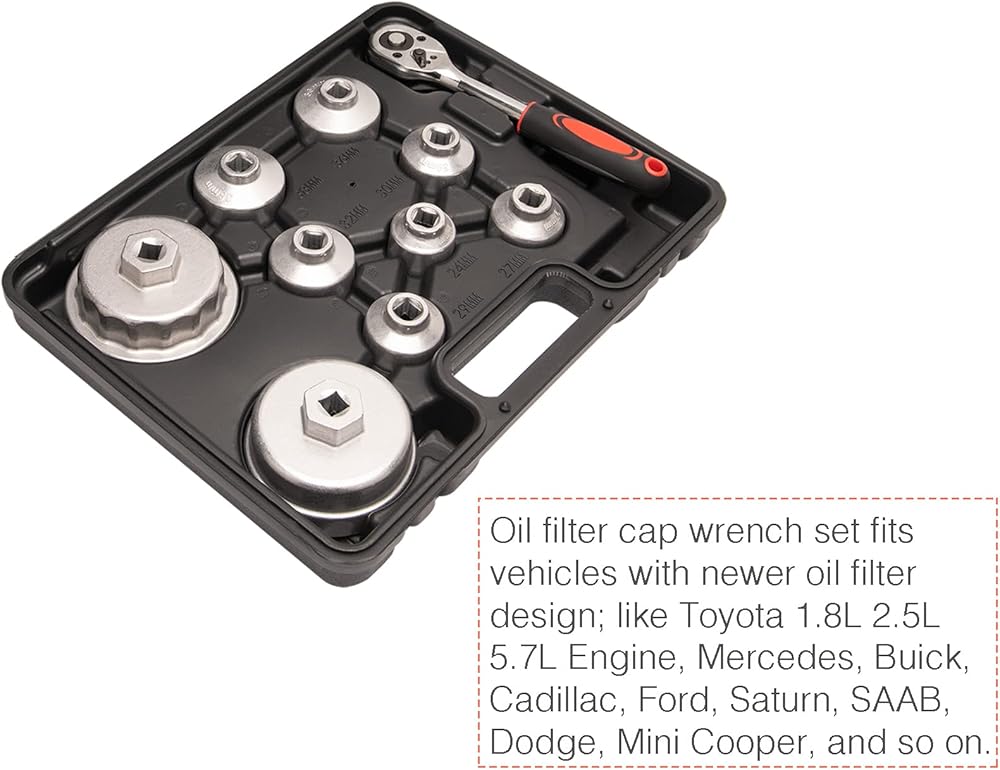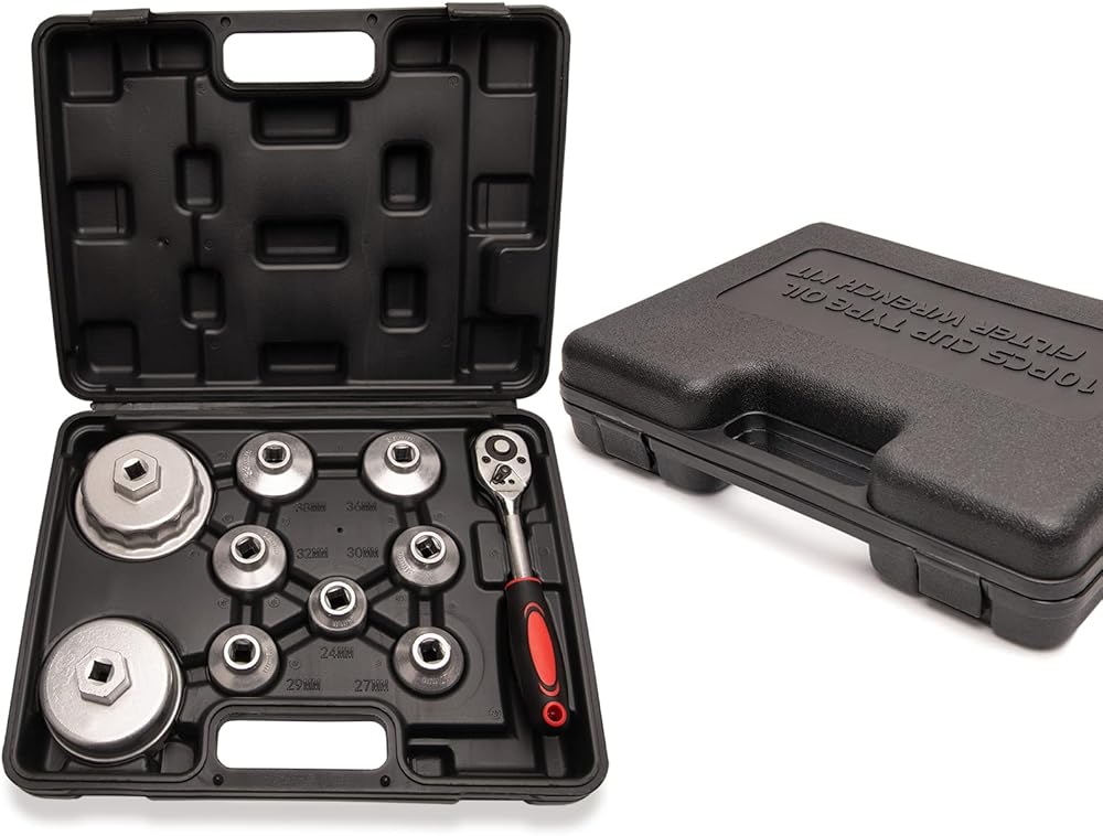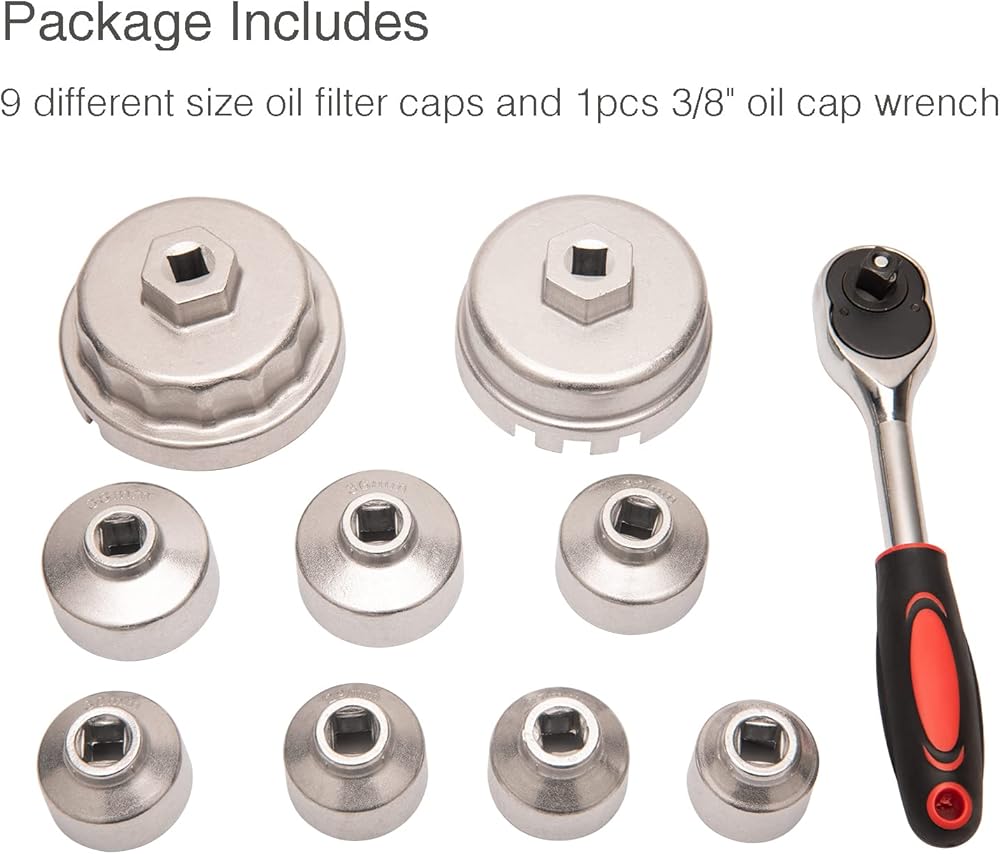 Replacing your oil and oil filter just becomes whole lot easier with this new oil filter cup set; The 9 caps offer a wide array of size to fit a variety of vehicles and the low-profile socket cap set allows to reach into the oil filter housing to easily remove an oil filter; The bonus wrench and ring spanner help remove jammed filters and caps. Plastic blow-molded carrying case for easy transportation, safe storage, and simple organization.
