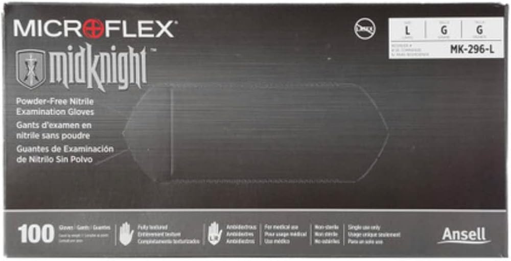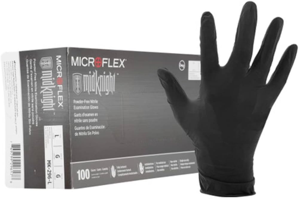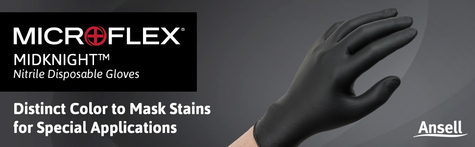 The Microflex MidKnight disposable, chlorinated, powder-free, standard length nitrile glove is fully textured along the fingertips, fingers, and palm and has a black color that hides stains and helps prevent visual distraction. It has a palm thickness of 4.7 mils and a finger thickness of 5.5 mils, and is 9.6"" long from the tip of the middle finger to the edge of the beaded wrist cuff, which is 3.1 mils thick. It is suitable for automotive, emergency medical services, funeral, industrial safety, laboratory, law enforcement, and tattoo applications. Nitrile provides better elasticity than vinyl, better puncture resistance than latex or vinyl, better abrasion resistance than chloroprene, and helps reduce the likelihood of allergic reaction. The glove is textured on the fingertips, fingers, and palm for improved grip, particularly in wet conditions, compared to a glove with textured fingers. It has been washed in a diluted chlorine-based solution to help reduce tackiness, providing lower surface friction than a non-chlorinated glove and allowing quick donning in wet environments. This powder-free glove leaves no residue, helping to reduce the likelihood of spreading bacteria compared to a powdered glove. The color of this ambidextrous glove is black. Tensile strength, measured in megapascals (MPa), is the amount of force required to rip a glove; the higher the number, the stronger the glove material. This glove has a tensile strength of 27 MPa before aging and 24 MPa after aging. Elongation measures how much a glove can be stretched before it breaks. It is expressed as a percent of the original length of the glove at the moment of breakage, and the higher the percent, the more the glove can stretch. This glove has an elongation of 500% before aging and 400% after aging. Acceptable Quality Level (AQL) is a Food and Drug Administration (FDA) quality specification for the defect rate in surgical and exam gloves. The FDA requires an AQL of 1.5 for surgical gloves and 2.5 for exam gloves. This glove has an AQL of 1.5, which means the defect level from a large sample of the gloves will not exceed 1.5%. Microflex examination gloves meet or exceed applicable standards imposed by ASTM International, formerly known as the American Society for Testing and Materials (ASTM), and the FDA. Disposable and limited-use gloves are used in medical, forensic, scientific, art, and industrial applications. Gloves are commonly made from flexible materials such as latex, nitrile, chloroprene, and vinyl. While most disposable gloves are designed for either hand, some can be purchased in hand-specific models. They are offered powdered or powder-free; silicone or silicone-free; chlorinated or non-chlorinated; coated or uncoated; with a standard- or extended-length cuff; sterile or non-sterile; and with textured or smooth fingers, fingertips, and palms. A glove's abrasion, cut, and puncture resistance is defined by glove material and thickness, and may be improved with the use of certain exterior coatings. Abrasion resistance means the glove helps protect the hand from contact with rough objects. Cut resistance means the glove helps protect the hand from blades and sharp instruments. Puncture resistance means the glove helps protect the hand from pointed objects such as pins and needles. Chemical resistance means the glove helps protect the hand from certain chemicals. Chemical resistance is defined by glove material, thickness, and length, as well as the work environment and chemicals likely to be encountered. For information on the chemical resistance of this glove, consult the manufacturer's chemical resistance guide. Microflex Corporation manufactures disposable gloves. The company, founded in 1988 and headquartered in Reno, NV, meets International Organization for Standardization (ISO) 13485:2003.
