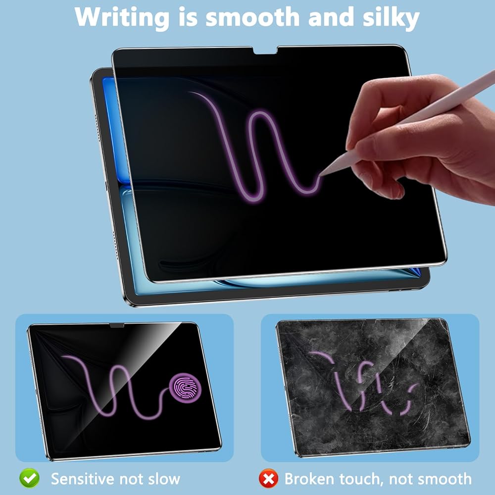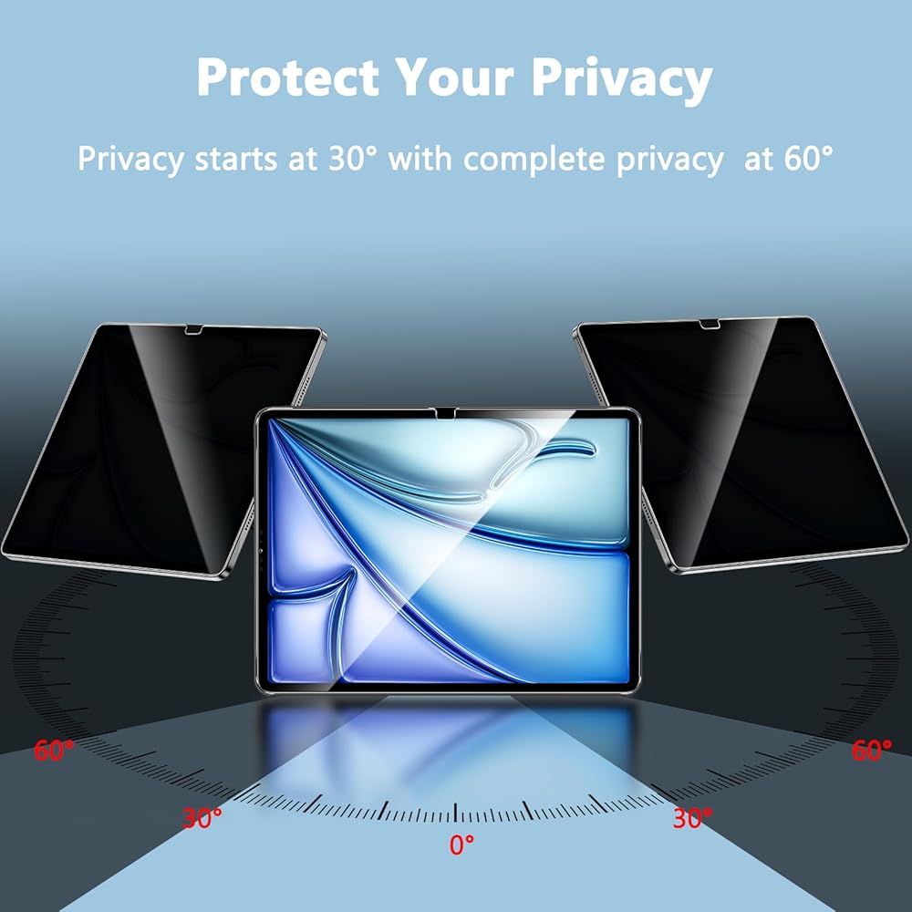 【حرفية عالية الجودة】تتوافق تمامًا مع شاشة الكمبيوتر اللوحي، وحجم رفيع للغاية ودقيق، ومتوافق مع Face ID. سوف تحصل على واقي شاشة للخصوصية عالي الدقة وحساس للمس ومتين لجهاز iPad Air 6th مقاس 13 بوصة.