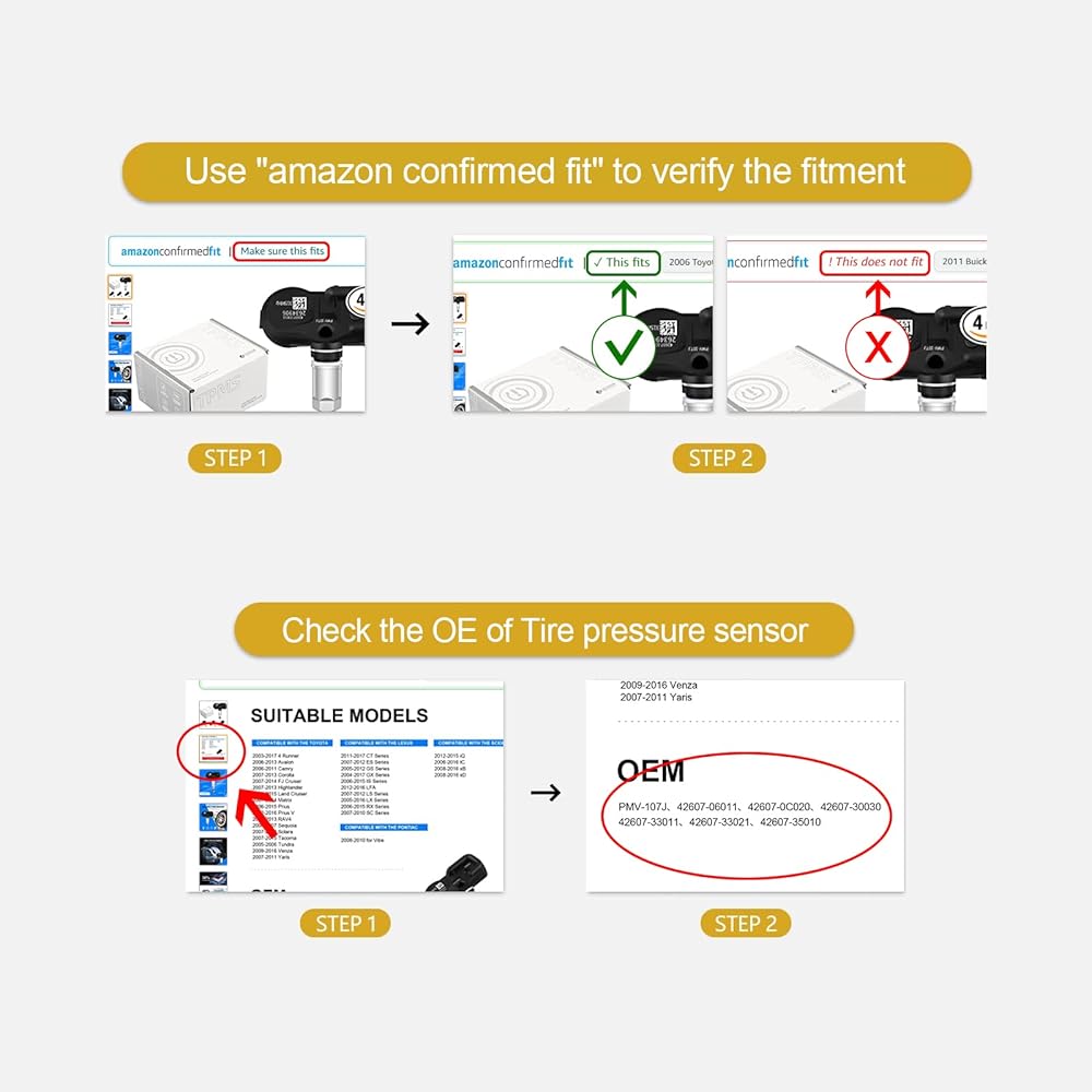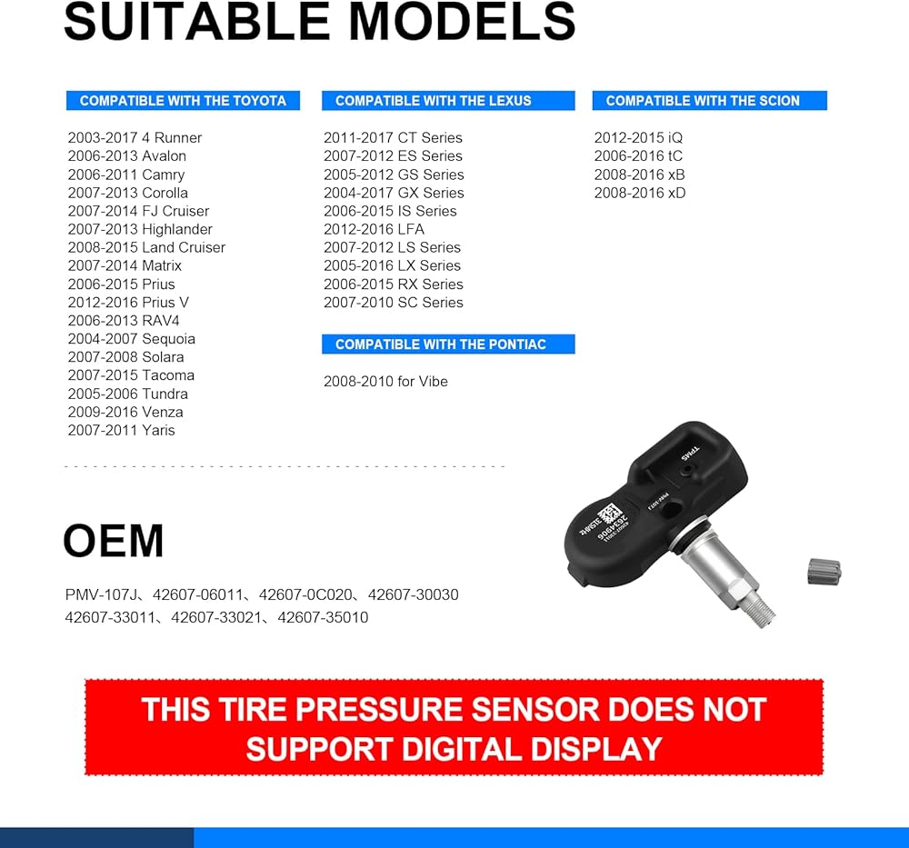 نماذج متوافقة: تتوافق أجهزة استشعار TPMS مع معظم سيارات Toyota 4 Runner/ Avalon/ Camry/ Corolla/ FJ Cruiser/ Highlander/ Land Cruiser/ Matrix/ Prius/ Prius V/ RAV4/ Sequoia/ Solara/ Tacoma/ Tundra/ Venza/ Yaris، Lexus CT/ ES/ GS/ GX/ IS/ LFA/ LS/ LX/ RX/ SC، iQ/ tC/ xB/ xD، بونتياك فيبي
