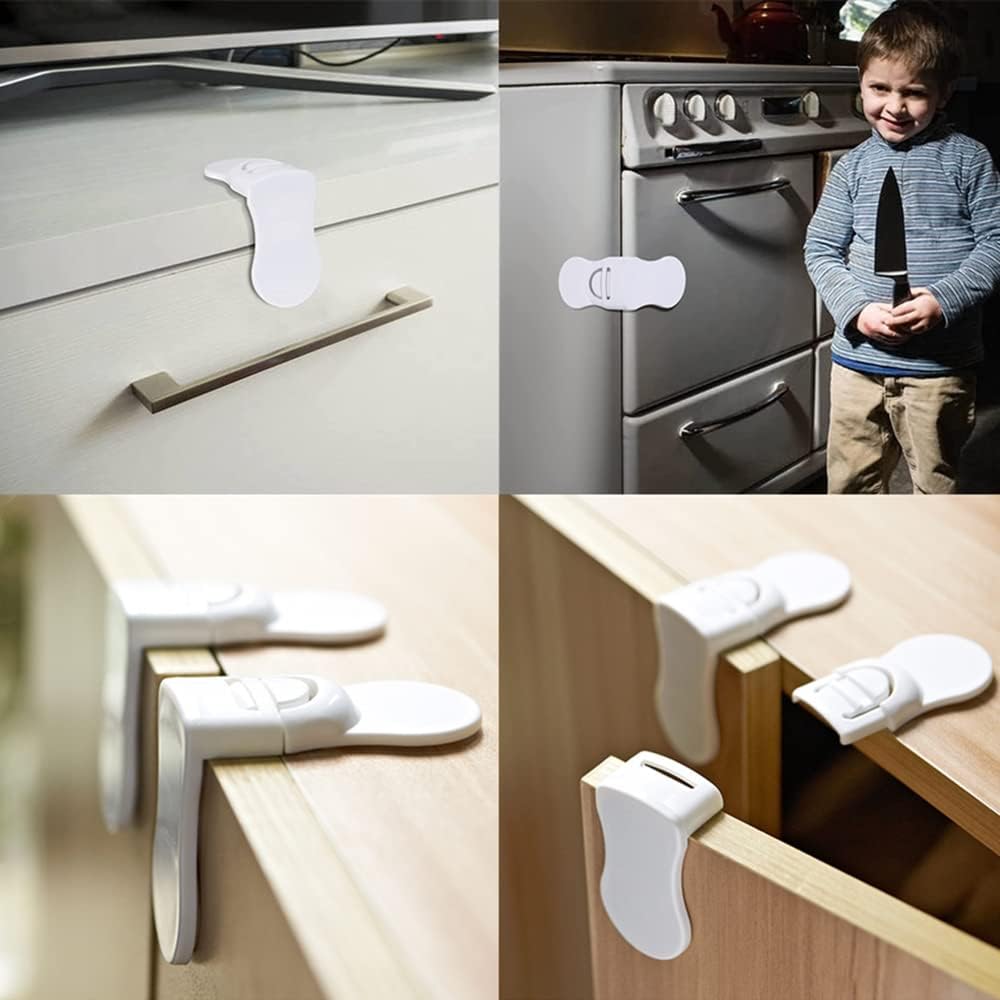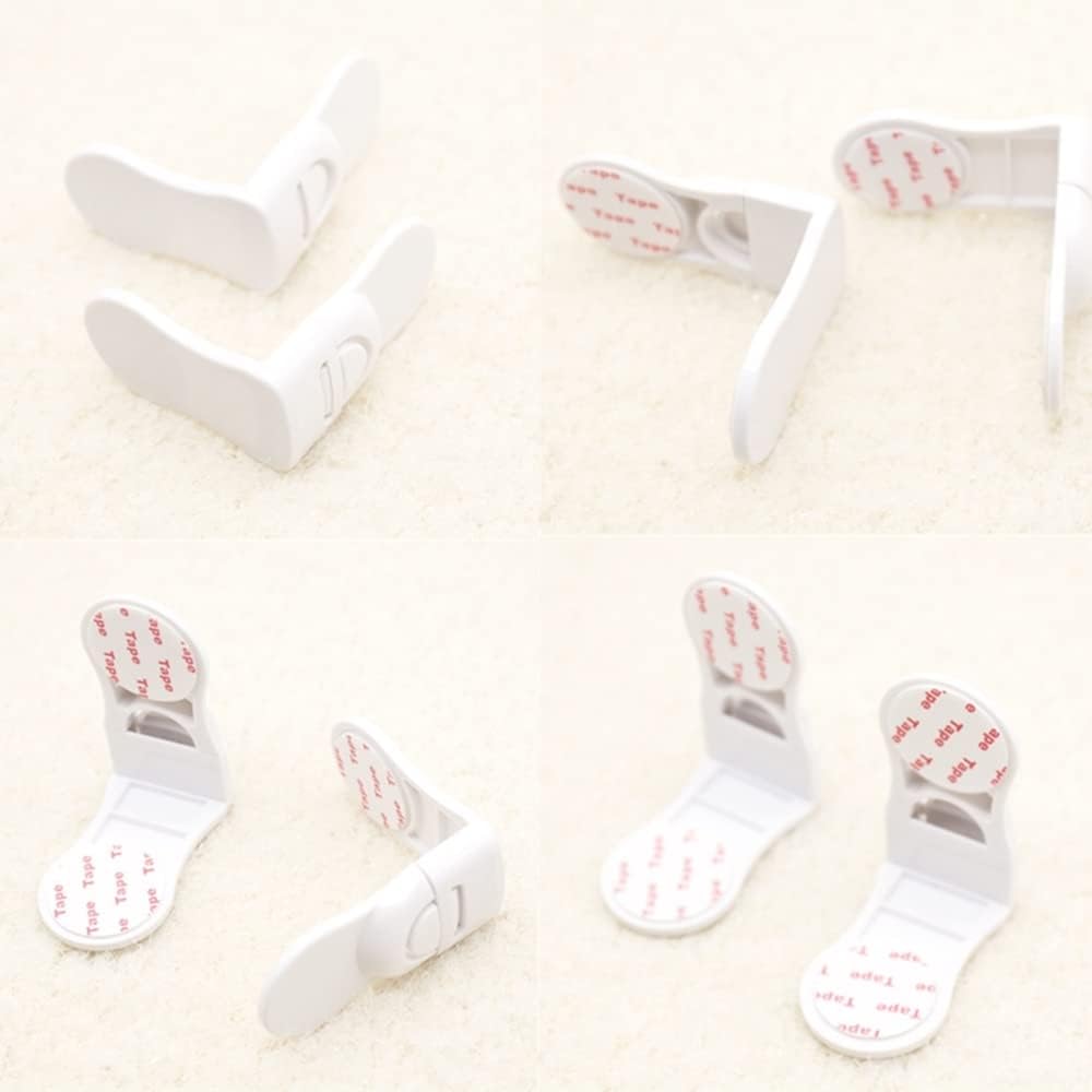 Package included: Package includes 6pcs children's cabinet safety locks in white, enough for your daily use needs High-quality materials: Drawer locks are made of high quality non-toxic ABS material, which does not contain ingredients harmful to children Advantages: Safety locks use premium 3M adhesive and you can install and remove baby drawer safety locks in seconds Easy to use: The installation method is simple for adults and will not cause damage or leave any marks on the furniture Application: Effectively preventing your child from getting into drawers and cupboards, using it can effectively stop potential hazards in your home