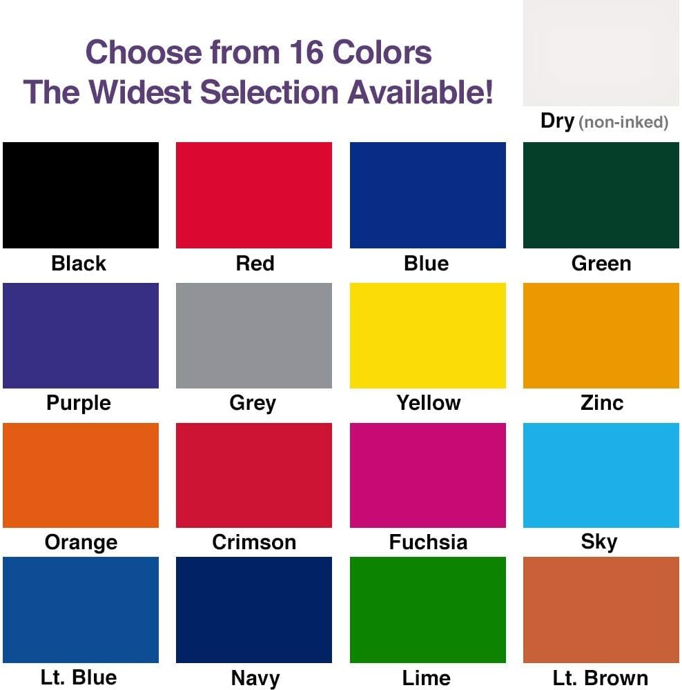 We offer sixteen COLOR choices (more than any other manufacturer), so that you can pick exactly the right tone and mood for your stamping needs. Choose from black, red, blue, green, purple, grey, yellow, zinc, orange, crimson, fuchsia, sky, light blue, navy, lime, and light brown. We know you will love the Extra Large Ink pad and guarantee it will perform for you for your stamping needs. What are you waiting for?