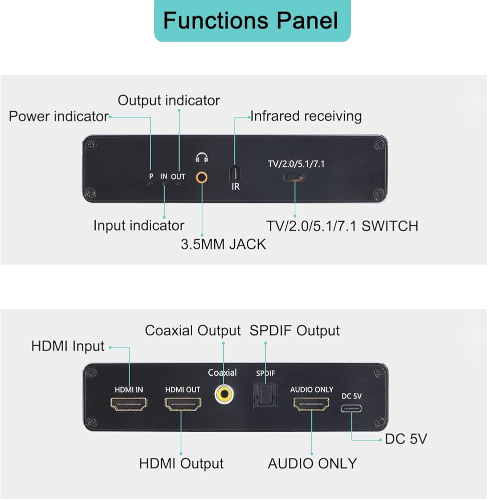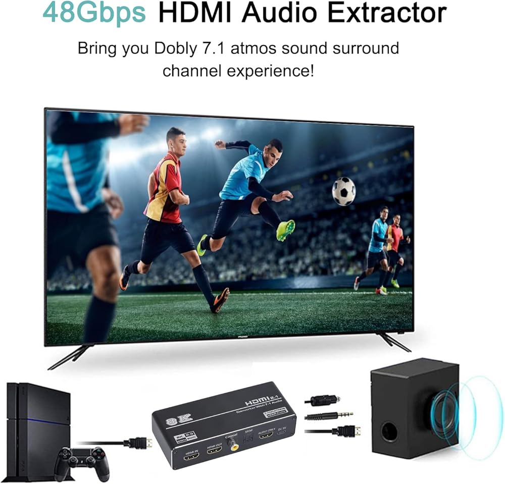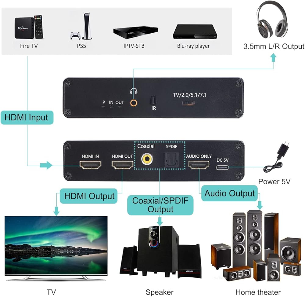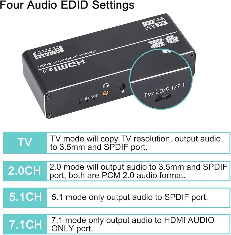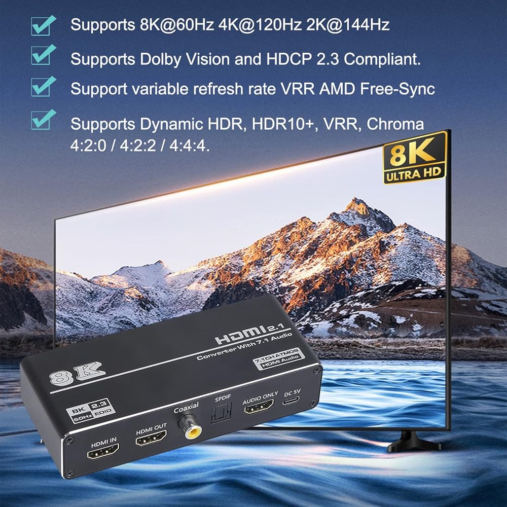 مستخرج صوت HDMI بدقة 8K، HDMI إلى HDMI + Toslink SPDIF البصري + مقبس صوت 3.5 ملم + محوري + مقسم صوت HDMI 7.1Ch