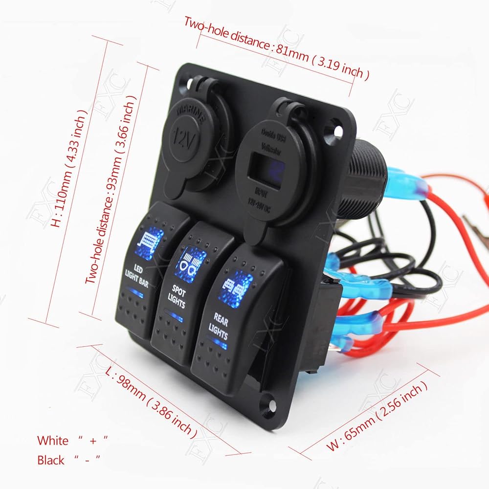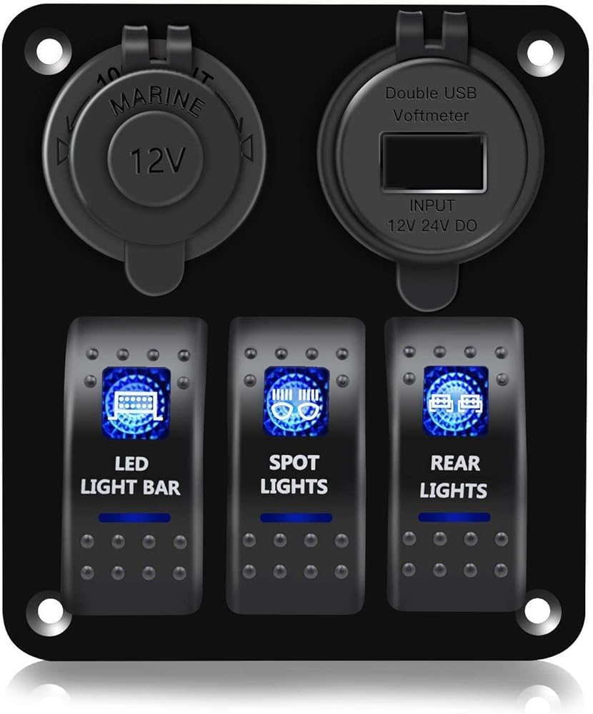 FXC 3 Gang Rocker Switch لوحة ألومنيوم مع مقبس شاحن منفذ USB مزدوج ومقبس ولاعة السجائر، ضوء LED أزرق مقاوم للماء، مفتاح تبديل للتشغيل والإيقاف لـ 12 فولت/24 فولت تيار مستمر، قارب بحري، شاحنة سيارة ATVs