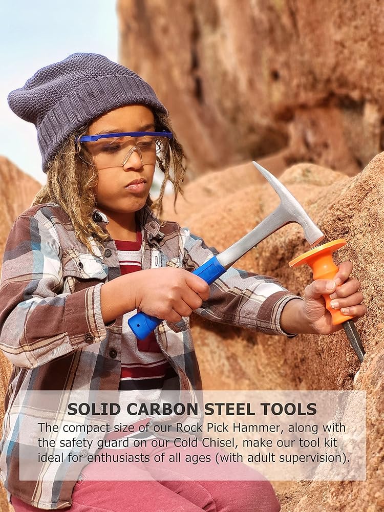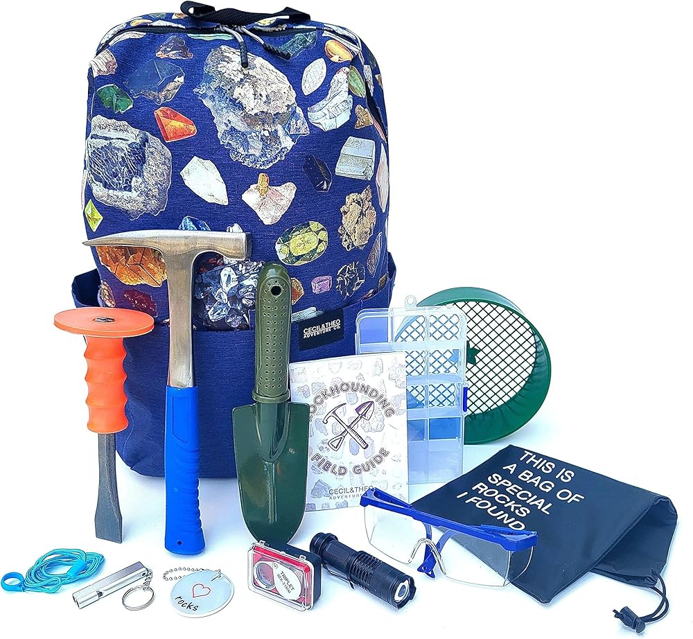 • Rock Collecting Kit: Our cute and trendy kit includes assorted rock hounding equipment: a rock pick hammer, cold chisel with safety guard, hand shovel, sand sifter, slotted box to collect specimens, black light flashlight, jeweler's loupe, keychain, safety glasses, field guide booklet, a medium-sized backpack to hold all kit components, and more.