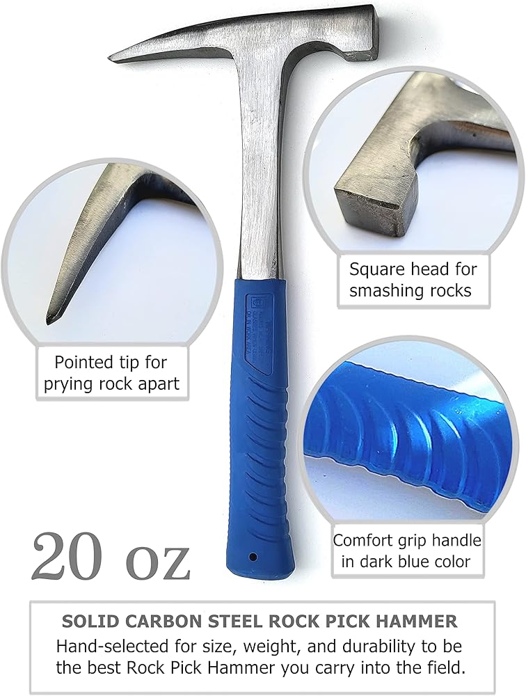 أدوات Rockhounding - مجموعة مطرقة اختيار الصخور الجيولوجية مع دليل ميداني لصيد الصخور مكون من 32 صفحة - حقيبة ظهر لحمل الإزميل ومجموعة الاختيار - هدايا الجيولوجيا للأطفال والكبار - مطرقة الصخور - معدات تعدين الذهب
